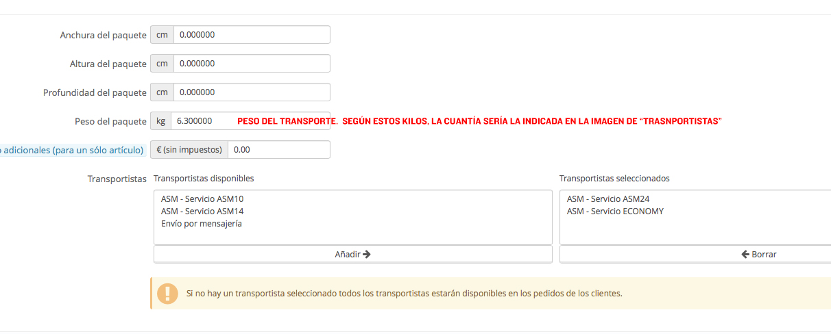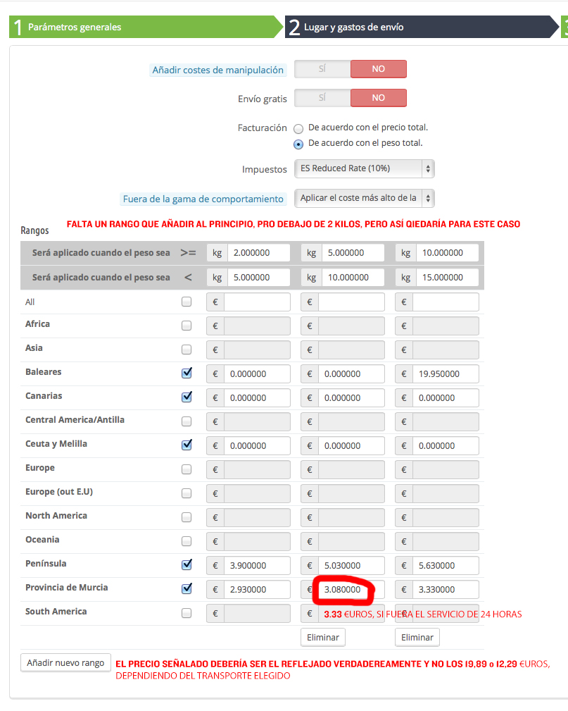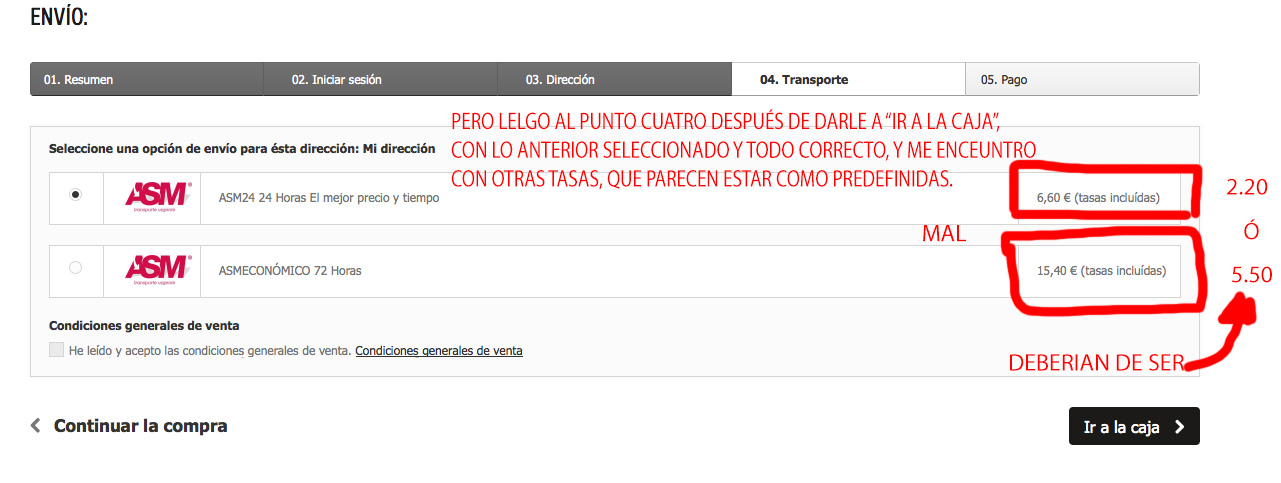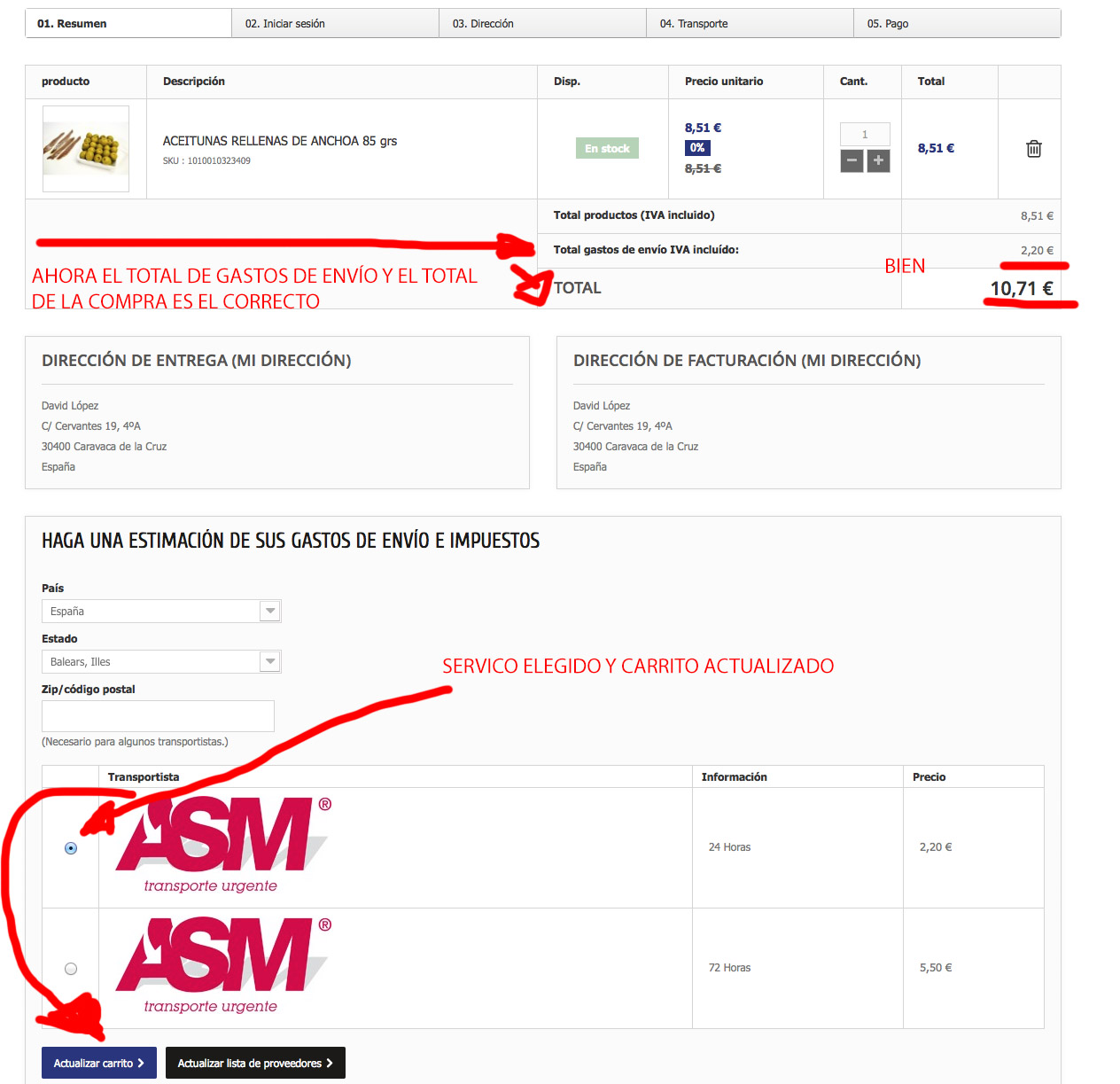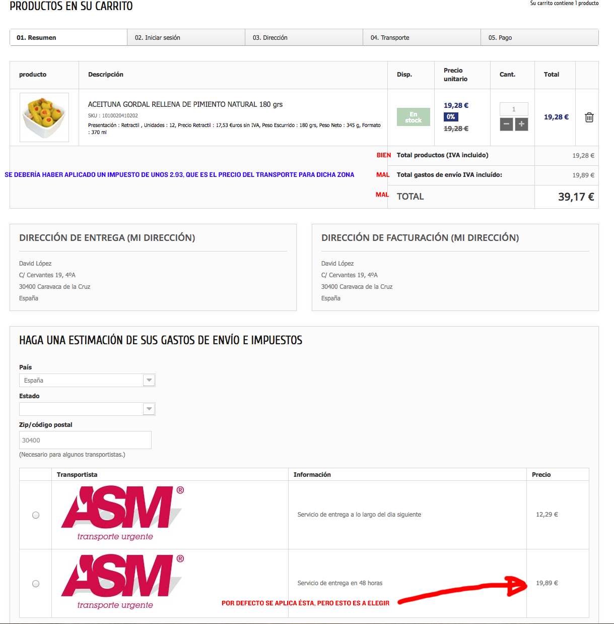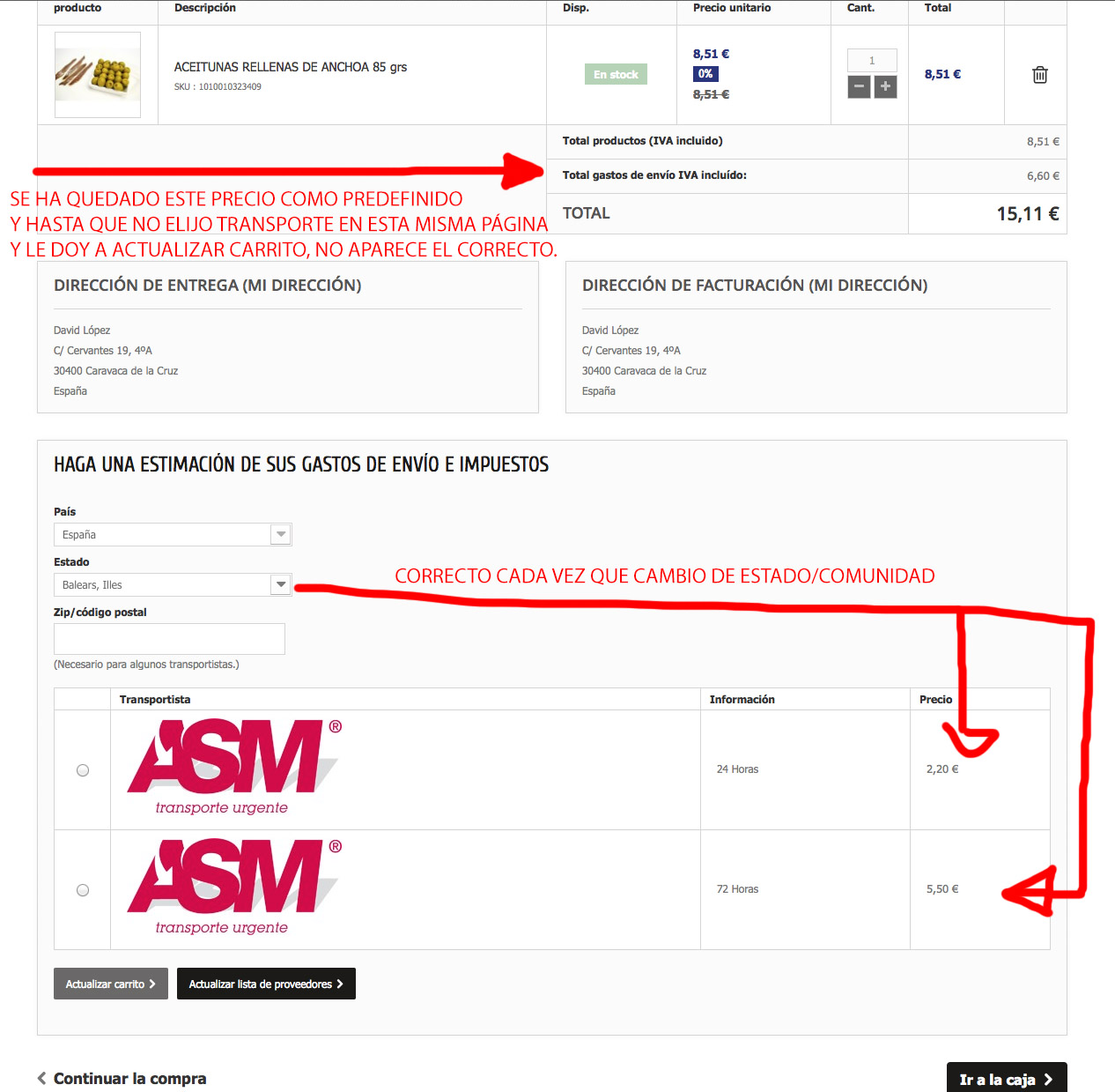 David López Posted August 15, 2015 Author Share Posted August 15, 2015 Hola.Actualizo la información después de varias pruebas más.He vuelto a configurar nuevamente los transportes, pero como si fueran nuevos y no los que me da por defecto la empresa (así me lo explicaban). Vale, he hecho un ejemplo con el servicio 24 horas y el Económico con un sólo rango de peso y diferentes precios, para ambos servicios (pruebas). Ahora, todo lo hace correcto, salvo cuando llega al penúltimo paso (transporte), que se vuelven a modificar las tasas de envío, cambiando evidentemente el precio final. Se ponen unos precios como predefinidos, porque hasta que no elijo servicio y actualizo carrito, aparece 6.60 € o 15.40 €. Os adjunto en orden, tres imágenes para que vean los pasos y el error. Las imágenes llevan comentarios para que os sea de mayor ayuda.Haciendo pruebas, parece como si la primera compra que hicieras, es la que luego ya tuviera de tasas fijas, fueran las zonas geográficas.Acabo de hacer dos compras, la primera ha salido correcta hasta el final de los pasos y la siguiente ya se ha quedado en el paso que les he comentado. Algo se me escapa.Espero que les sirva de ayuda y me puedan terminar de ayudar.Muchas gracias y disculpen. Link to comment Share on other sites More sharing options...