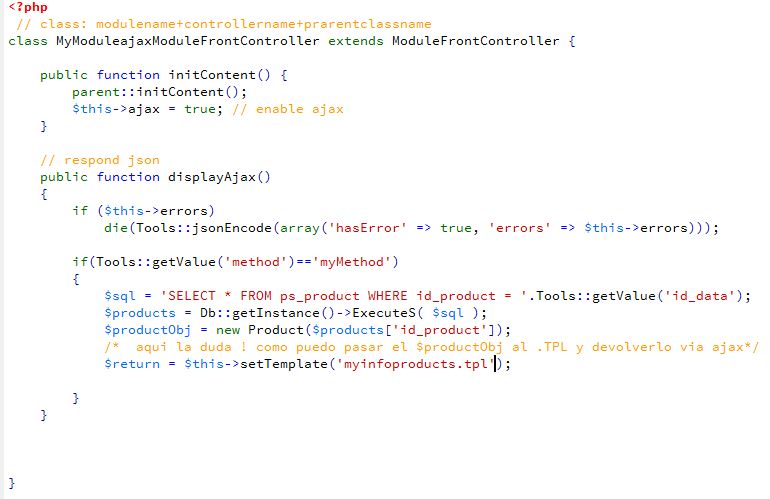 apositivo Posted August 14, 2015 Share Posted August 14, 2015 saludos comunidad ! estamos realizando pruebas de comunicación en prestashop y estamos estudiando las limitantes, tenemos un modulo que nos genera un boton como el mostrado en la figura, funciona perfectamente, se comunica con nuestro controller via ajax y trae la informacion solicitada. ahora tenemos un nuevo reto, queremos saber si en ese metodo que se ejecuta via ajax al presionar el boton se le puede asignar contenido de un TPL vista del boton (archivo AJAX_DIV.jpg) <input type="text" id="id_data" value="1"/> <button id="ajax-data">Click para traer data via ajax</button> <div style=" border-style:dashed; border-color:#000000" id="contenido"> EN ESTE DIV SE MOSTRARA LA INFORMACION <BR> QUE VIENE VIA AJAX</div> codigo en ajax.js $(function() { $('#ajax-data').click(function() { var query = $.ajax({ type: 'POST', url: baseUri+'module/MyModule/ajax', data: 'method=myMethod&id_data=' + $('#id_data').val(), dataType: 'html', success: function(data) { console.log(data); } }); }); }); codigo en el controller: <?php // class: modulename+controllername+prarentclassname class MyModuleajaxModuleFrontController extends ModuleFrontController { public function initContent() { parent::initContent(); $this->ajax = true; // enable ajax } // respond json public function displayAjax() { if ($this->errors) die(Tools::jsonEncode(array('hasError' => true, 'errors' => $this->errors))); if(Tools::getValue('method')=='myMethod') { $sql = 'SELECT * FROM ps_product WHERE id_product = '.Tools::getValue('id_data'); $products = Db::getInstance()->ExecuteS( $sql ); $productObj = new Product($products['id_product']); /* aqui la duda ! como puedo pasar el $productObj al .TPL y devolverlo via ajax*/ $return $this->setTemplate('myinfoproducts.tpl'); } } } Link to comment Share on other sites More sharing options...