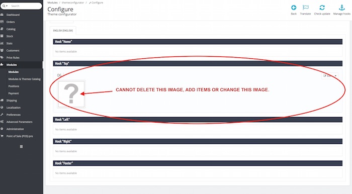 My client wanted to add a static banner instead of the slider.  I disabled the slider, modified the configurator "Top Hook" to 100% width and then deleted the default top hook images that are displayed on the default theme thinking I would just add another.  EXCEPT, when I went to delete the last image, it seems to have broken the configurator somehow.  I cannot add a new item to any hook location (although it says it has been added and the image shows in the img file in the configurator module folder), I cannot change the current image which is a big question mark (see below).  I have uploaded a completely new configurator folder hoping that would work... but nothing.  I must be overlooking something but I am at a loss.  Unfortunately this site is to go live Monday morning US, EST.  PLEASE, ANYONE have any ideas???