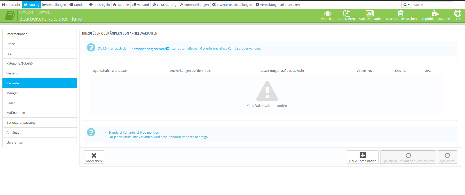 hyller Posted August 15, 2015 Share Posted August 15, 2015 Hallo, ich fülle gerade unseren Onlineshop mit Artikeln die teilweise auch in Varianten angeboten werden sollen. Die Varianten lassen sich auch anlegen aber auf der Seite Katalog>Artikel>Varianten lassen sich diese nicht zuordnen, da die Speicher-Buttons grau hinterlegt sind und rotieren. Habe für folgendes Problem leider keine Lösung gefunden. Alle anderen Ansätze waren eher allgemeiner Natur, also wenn das Speichern generell nicht geht oder das BO sehr langsam ist. Das ist bei mir nicht der Fall. In allen anderen Bereichen flutscht es. Nur an dieser Stelle dieses Phänomen. Prestashop Vers. 1.6.0.9 Installation über Strato. Theme: bleached Jemand eine Idee? Vielen Dank vorab! Marco Link to comment Share on other sites More sharing options...