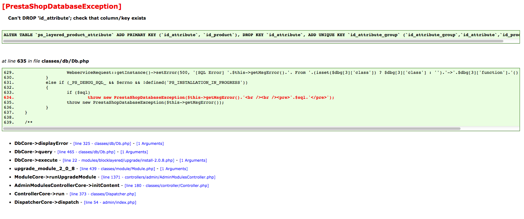 1.6.0.9 [PrestaShopDatabaseException] Can't DROP 'id_attribute' while upgrading modules