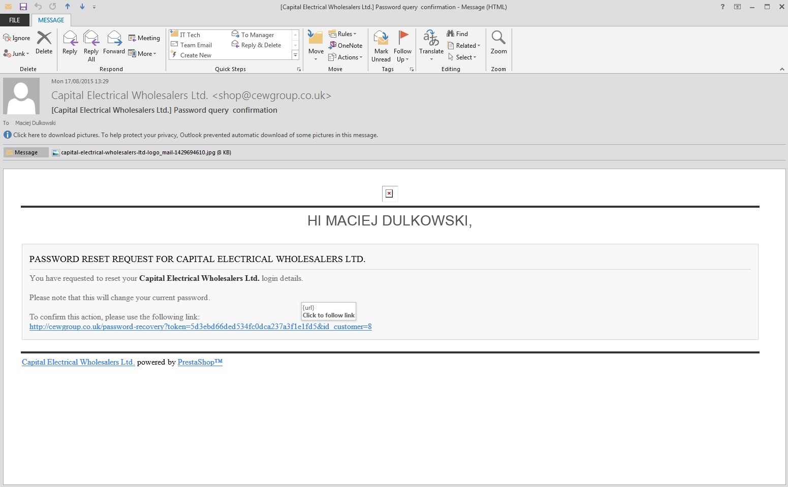 PrestaShop is sending succesfully email but link in email not working (see attached screenshot)