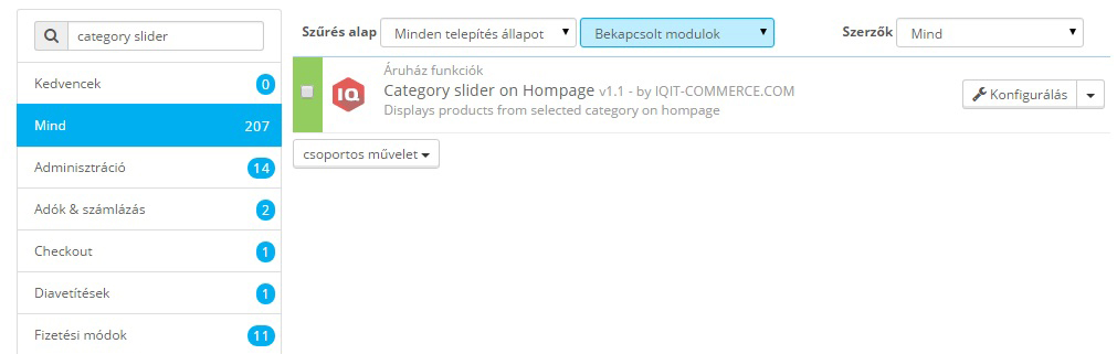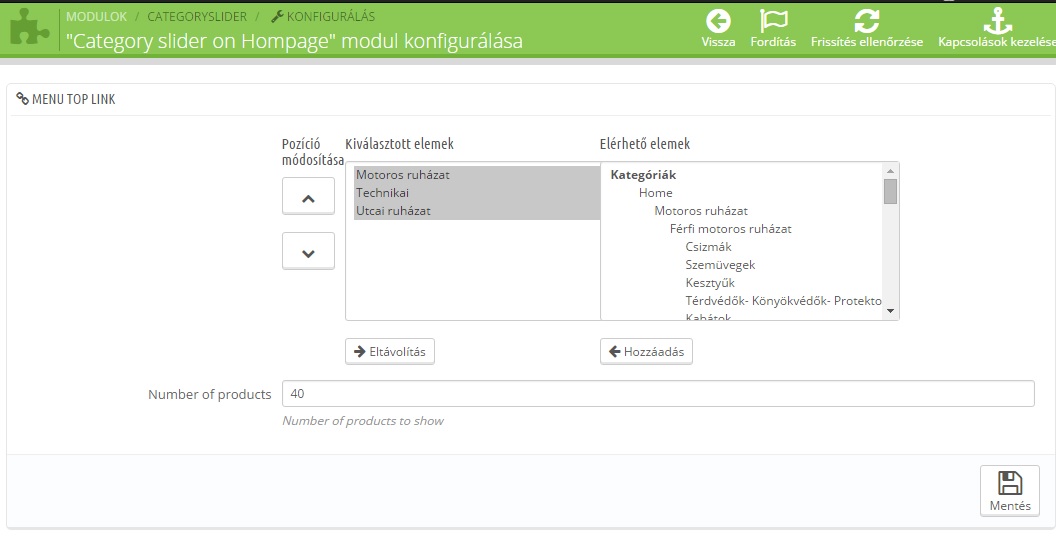 Zsolt55 Posted August 17, 2015 Author Share Posted August 17, 2015 (edited) Köszi a gyors választ! Prestashop verzió 1.6.0.9Jelenleg használt sablon warehouseCategory slider verzió:Category slider on Hompage v1.1 Ez egy fizetős sablonhoz tartozó modul. Nem tudom pontosan miről kellene kép, de csináltam párat. Egyet a modul listából, egyet a config felületéről és egyet magáról a megjelenéséről. Edited August 20, 2015 by Zsolt55 (see edit history) Link to comment Share on other sites More sharing options...
