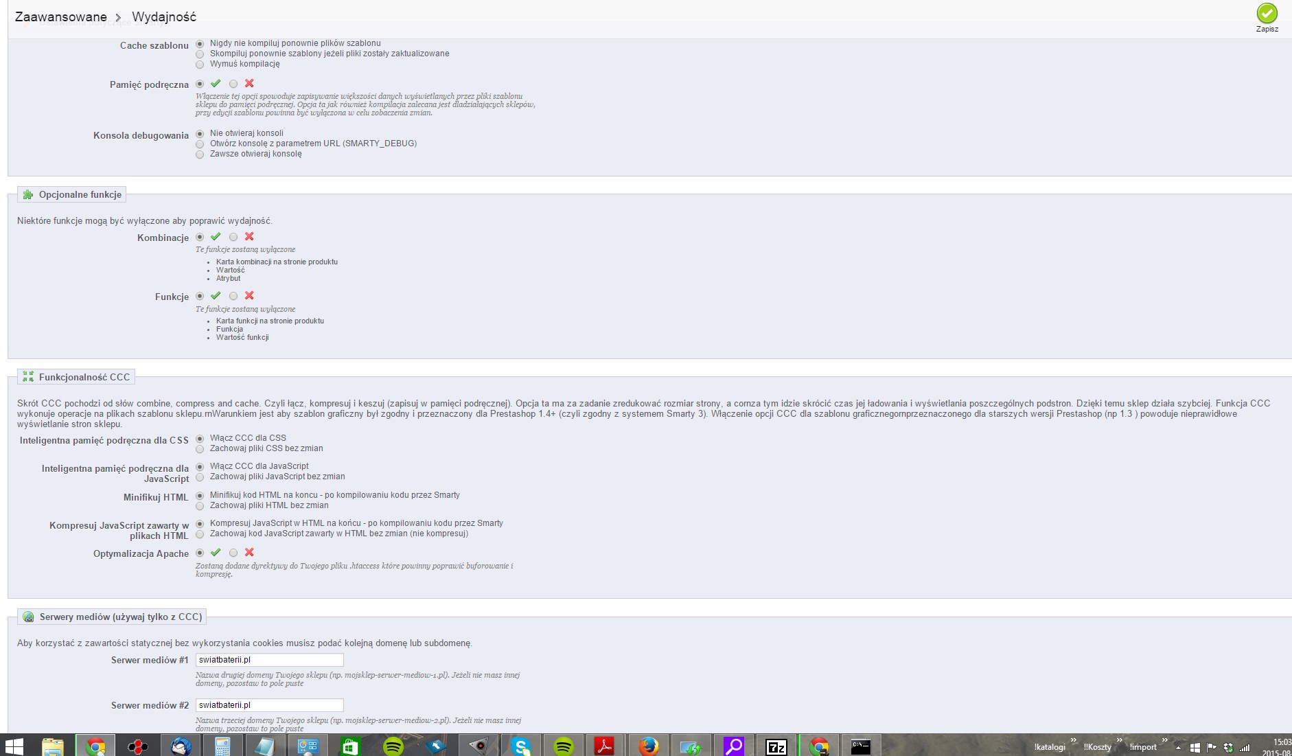 Jak ponownie wyczyszczę historię w przeglądarce to dana karta produktu się wczyta, więc tutaj na pewno chodzi o konfigurację sklepu i jakieś pliki cache. W załączniku też konfiguracja z Zaawansowane -> Wydajność do wglądu.