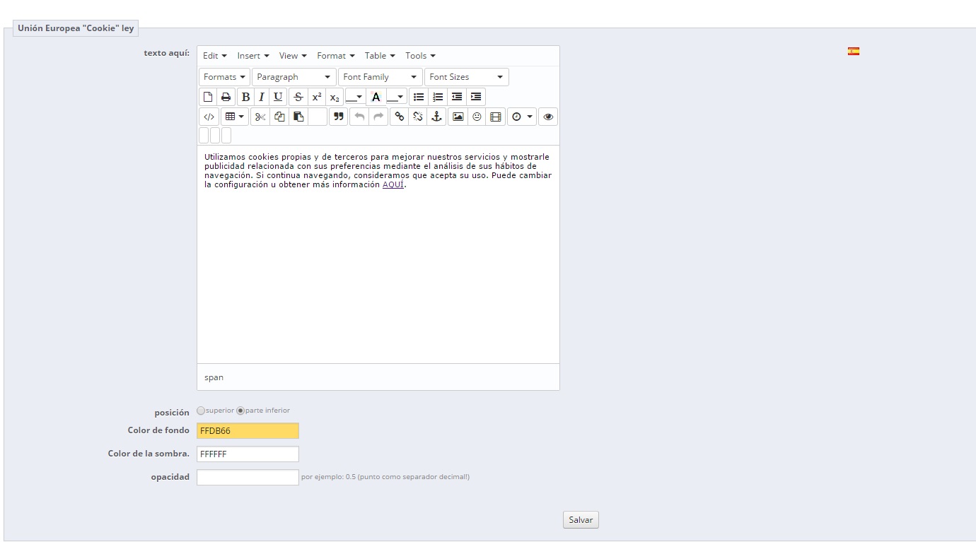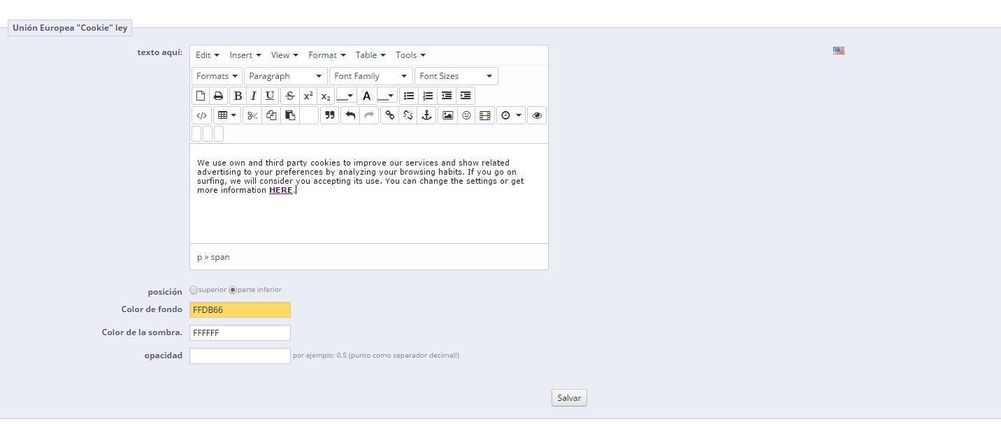 I'm spanish, and I do a web in spanish and in english. In the spanish version, the modul of european cookies law works, but when I write the text in the english version and I press "save", the english not maintained in the back office, it disappears.
