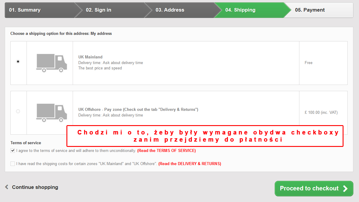 Powiem tak. Doszedłem, że jest to w pliku orrder-carrier.tpl, ale chodzi mi o to, żeby system wymagał dwóch pól do akceptacji, zanim przejdzie do następnego kroku, czyli płatności.