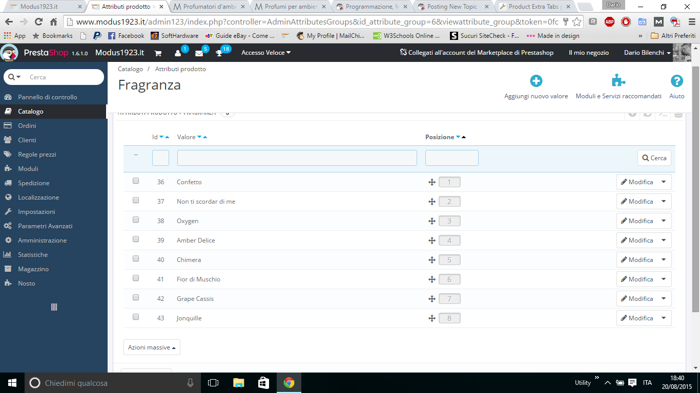 The bestfaraway Posted August 20, 2015 Share Posted August 20, 2015 Vendendo profumazioni nel mio e-commerce ho bisogno di inserire ad esempio le fragranze di queste ultime. Ho aggiunto le fragranze dal menù catalogo-->attributi prodotto. In seguito ho creato i valori nome della fragranza. In pratica vorrei sapere se è possibile avere per ogni valore fragranza che inserisco dei dati in più come ad esempio la descrizione della fragranza visibile sul sito e un immagine descrittiva. Grazie . In allegato lo screenshot della schermata di modifica a cui mi riferisco. Quindi volevo sapere se, ad esempio, come accade nell' attributo colori che si vede una texture di esempio del colore, sarebbe possibile aggiungere campi specifici come una piccola immagine o banner,descrizione in più per ogni fragranza. Grazie ancora e a risentirci. Link to comment Share on other sites More sharing options...