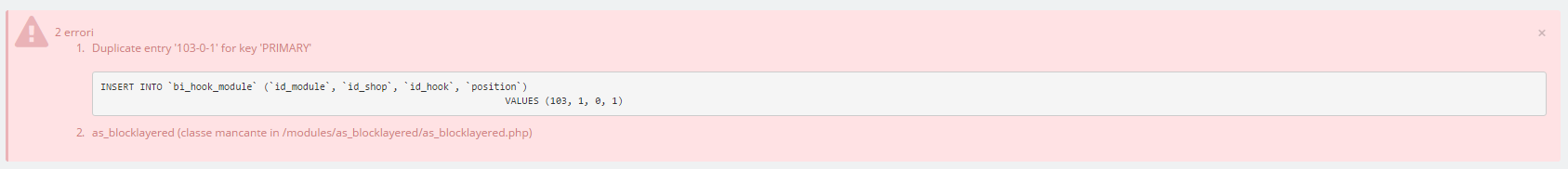 mdaldoss Posted August 20, 2015 Share Posted August 20, 2015 I'm posting this question since this is only happening in the upgraded site, not in the original site. I did everything according to the suggestion here in the forum: I made an exact replica of the original ecommerce (not without some troubles) and I started the update. I fixed some issues: defines.inc.php corrupted and replaced with the original one from the 'clean' distribution removed the modules that caused problems loading resolved the id_product_2 issue, according to the solution provided by the forum fixed original template porting issues (deleting the rows from the php files) And i got a working wordpress at 1.6.1.1. I even placed an order. But. When I try to switch to any template (the main reason I tried to update my site) I got the error in attachment, stating I'm trying to insert a duplicate into the database. What am I doing wrong? It appears the single theme isn't the problem (I got the same issue changing to the default bootstrap theme). I tried removing all non-prestashop modules, since it seems to be connected to the installation of new modules. I read is difficult to revert the site to a 'clean state', but is there a possibility to understand which hook causes the trouble and to skip it? Thanks in advance for your time, M. Link to comment Share on other sites More sharing options...
