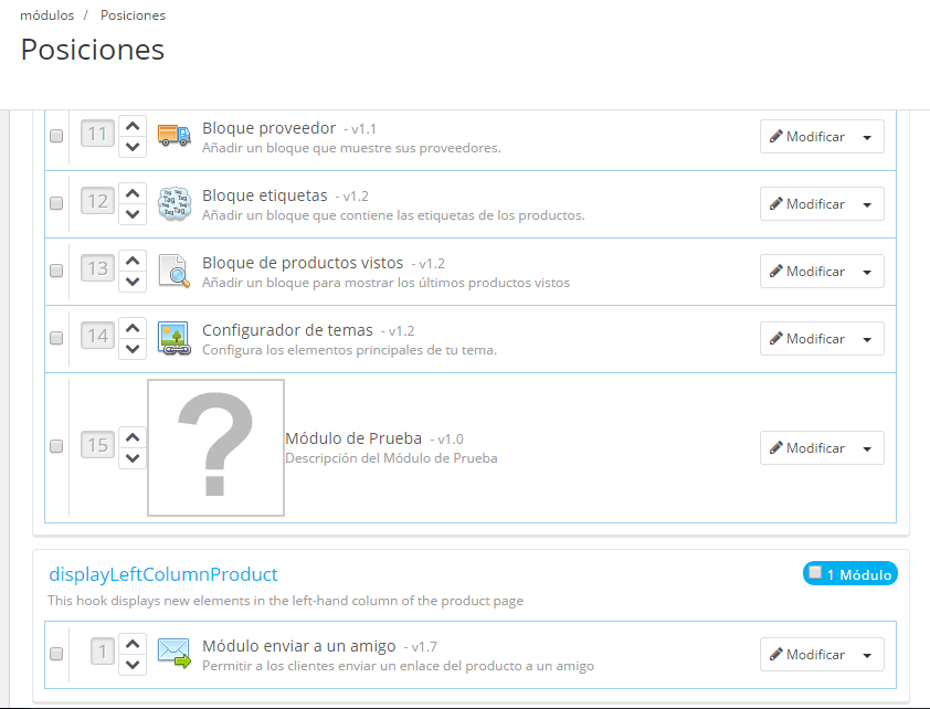 danielgdz Posted August 21, 2015 Share Posted August 21, 2015 (edited) Buenas a todos,Soy nuevo en Prestashop y acabo de crear un módulo llamado "moduloprueba" en la carpeta "/prestashop/modules/moduloprueba" la cual contiene los archivos "moduloprueba.php", "moduloprueba.tpl" y config_es.xml. En un inicio, todo iba bien, logré instalarlo desde al Administrador y ubicarlo en la posición "displayLeftColumn", como se ve en la imagen adjunta. Mi problema es que no logro visualizar el módulo por ninguna parte. Ya reinicie el módulo, lo desinstale y volví a instalarlo, pero no consigo verlo en el front end. Espero sus comentarios, y si estoy teniendo un error hasta el momento. Para especificar, estoy usando la versión 1.6.10 de Prestashop. No he hecho ninguna modificación. Mi archivo moduloprueba.tpl sólo es un "Hola mundo". Un saludo y gracias PD: Seguí este tutorial, https://youtu.be/oSWsQ4zPVk4?list=PLx0w6s78kIfGPwMPyjRP7Hj4kajupp1G2 moduloprueba.php Edited August 21, 2015 by danielgdz (see edit history) Link to comment Share on other sites More sharing options...