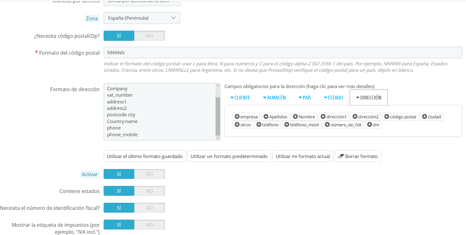 tuk66 Posted August 25, 2015 Share Posted August 25, 2015 Sí, esta es una nueva característica en esta versión. Algunos campos de dirección no se muestran en las facturas (y albaranes, ...). Trate de cambiar el nombre/borrar/cambiar los nuevos registros de configuración en la tabla ps_configuration: Yes, this is a new feature in this version. Some address fields are not shown on invoices (and delivery slips, ...). Try to rename/delete/change new configuration records in the ps_configuration table: PS_INVCE_INVOICE_ADDR_RULES PS_INVCE_DELIVERY_ADDR_RULES 1 Link to comment Share on other sites More sharing options...