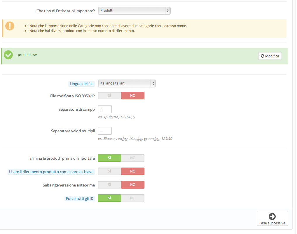 Eleg Posted August 25, 2015 Share Posted August 25, 2015 Ciao a tutti, sto sperimentando l'importazione del catalogo mediante file csv. Dopo tante prove non sono arrivata ad un punto soddisfacente. Praticamente ho creato su ps le categorie. Ho creato un file csv (esportato da un gestionale) con 435 articoli. Ho caricato nella cartella import sotto admin il file prodotti.csv e tramite bo importo il file scegliendo da storico ftp. Scelta l'entità PRODOTTI da importare e impostato a si solo ELIMINA PRODOTTI PRIMA DI IMPORTARE e FORZA TUTTI GLI ID, procedendo nell'importazione ci mette circa 15 minuti e poi mi appare un schermata con un errore cache. Se utilizzo il tasto back e vado a vedere il catalogo mi ha caricato 135 articoli ( a volte 111, a volte 120 ) ma comunque mai tutti... Come posso risolvere il problema? Ho provato con diverse linee telefoniche, ma il risultato è simile. Cosa posso fare? Grazie Ciao Eleg Link to comment Share on other sites More sharing options...