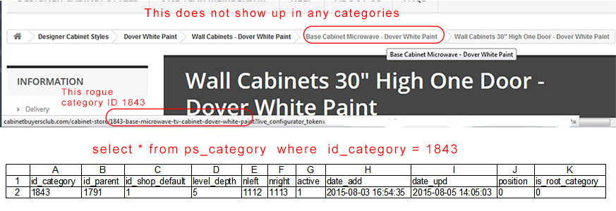 BTutt Posted August 29, 2015 Author Share Posted August 29, 2015 I attached a screen shot of one of the unrelated categories (see roque-category.jpg). I have searched through the categories and cant find it listed in the back office. So, I did a SQL query: select * from ps_category where id_category = 1843It looks like it exists but doesn't show up in the category lists. I manually looked at the category table and there it was. I reported this as a bug, but have heard nothing back. I believe the cause was a bug in PS 1.6.0.1 that didn't delete categories properly, but that is just my best guess. I had added categories via CSV import using PS 1.6. Some of the categories I deleted. Finding this issue, I upgraded to 1.6.1 hoping that would fix the problem. It did not.Doing a manual search I found 22 categories that were in the category table that were not showing up in the back office. I am guessing there are more. So, I manually disabled these rogue categories by setting the active number from 1 to 0. That seems to have worked - so far. The rogue categories do not show up in the breadcrumb navigation and the disabling of them doesn't seem to have hurt all the work I have done. Since I don't know how PS works with the tables, I'm just trying to fix this by trial and error. I would delete them, but I am not sure if they are tied into other tables in the database.Does anyone know of a SQL query that will find all the categories that are not showing up in the BO? How about a SQL query or fix to delete these rogue categories safely without damaging the work I have done? Link to comment Share on other sites More sharing options...