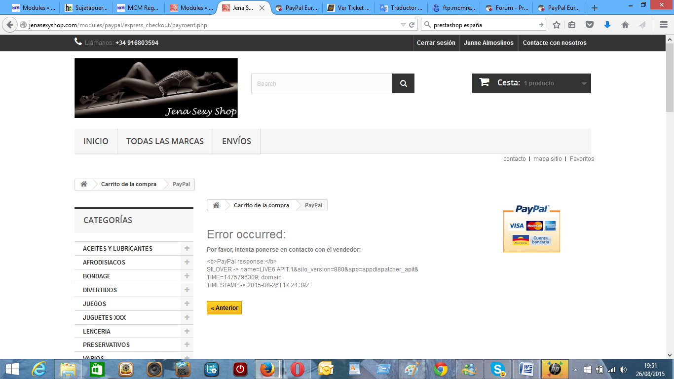 junnecito Posted August 26, 2015 Share Posted August 26, 2015 Buenas tardes: Vengo de actualizar mis tiendas de la version 1.6.0.14 a la ultima version 1.6.1.1, todo normal hasta que un cliente me llamó para decirme que no puede realizar el pago por PayPal, tengo la ultima version del modulo PayPal y me aparece el siguiente error: Error occurred:Por favor, intenta ponerse en contacto con el vendedor: <b>PayPal response:</b> SILOVER -> name=LIVE6.APIT.1&silo_version=880&app=appdispatcher_apit&TIME=1475796309; domain TIMESTAMP -> 2015-08-26T17:24:39Z Probe con versiones anteriores del modulo PayPal pero igual. Alguien por favor podria ayudarme con esto? Agradeciendo de antemano vuestra ayuda. Saludos P.D. Me sucede en 2 tiendas. Link to comment Share on other sites More sharing options...