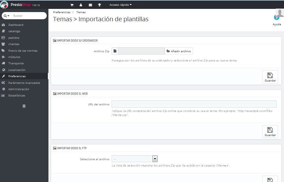 KristineKDMK Posted August 29, 2015 Author Share Posted August 29, 2015 no hay problema Kristine, exacto, en el back office, en "Preferencias" > "Temas" se administran los temas de la tienda. entonces descartamos el peso de los temas como problema para el proceso de instalacion. claro, intenta subir los temas en el archivo .zip correspondiente y vuelve a intentar visualizarlos en el back office. creo que este enlace te pude ayudar sobre los permisos, tengo entendido que deberian ser 755 en el directorio de "themes" (lo puedes comprobar en el mismo filezilla al hacer click derecho en el directorio > "atributos de archivo") Hola de nuevo tiluces, Adjunto captura de pantalla de lo que me aparece a mi al meterme en Preferencias>Temas>Agregar nuevo tema, porque no es lo mismo que aparece en el video del enlace (no me aparece la opción de importar desde ftp ni nada parecido). De ahí mi problema. Link to comment Share on other sites More sharing options...