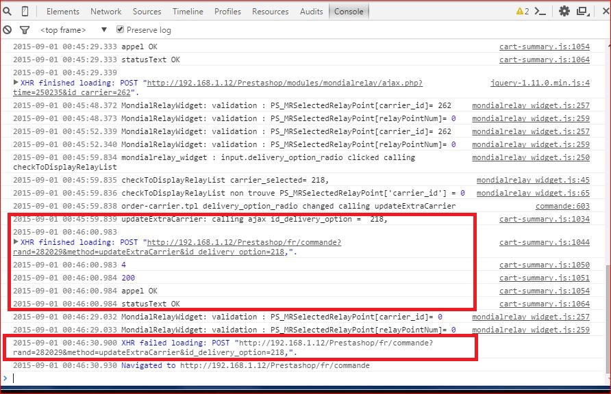 PBo34 Posted September 1, 2015 Share Posted September 1, 2015 Bonjour, Je suis en train d'essayer de faire marcher le module Mondial Relay sur mon site Prestashop que j'ai upgradé de 1.5.6.2 à 1.6.0.11 (WAMP en local). Ca fonctionne apparemment, mais dans un cas, je reçois ces messages d'erreur dans la console de chrome : XHR failed loading: POST "http://192.168.1.12/Prestashop/fr/commande?rand=232225&method=updateExtraCarrier&id_delivery_option=218". Les paramètres sont bidons, ils m'ont juste servi à identifier quel appel génére l'erreur. Ce que je ne comprends pas, c'est que j'ai déjà reçu les codes retours de cet appel qui indiquent que tout s'est bien passé, et ce message ne vient qu'au passage à la page suivante (processus de commande, de la page du transporteur à la page du paiement). Il arrive même que je reçoive cette même erreur pour chacun des 3 appels de la page transporteurs, et il arrive qu'elle ne se produise pas. Il y a donc un facteur aléatoire. J'ai changé l'appel en synchrone, j'ai enlevé ajax et fait l'appel en javascript etc. Je n'y comprends rien. Ca fait des jours que je rame là-dessus, ca serait vraiment sympa si quelqu'un a une idée. Merci d'avance. Link to comment Share on other sites More sharing options...