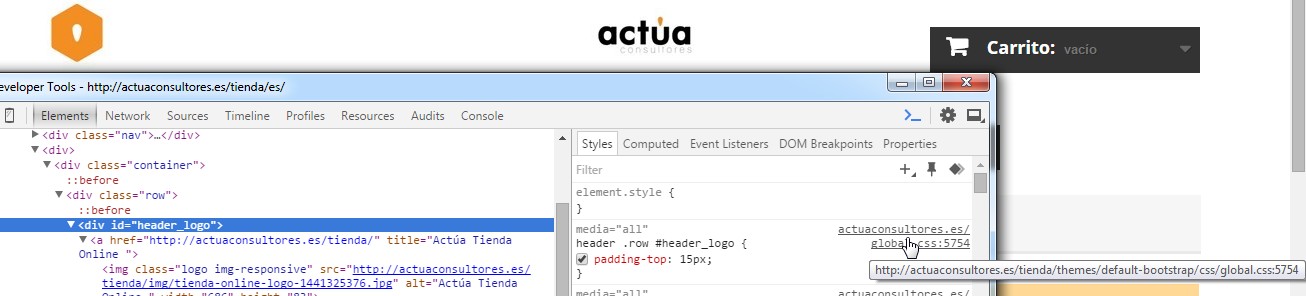 elvega3009 Posted September 4, 2015 Author Share Posted September 4, 2015 Hola de nuevo, He conseguido agrandar el logo de cabecera tal y como quería, lo que no consigo es poder poner la barra de búsqueda rápida justo debajo del logo de cabecera, he hecho pruebas para moverla pero me mueve también el carrito de compras y yo eso no quiero que se mueva de donde está. ¿Cómo puedo mover la barra de búsqueda justo debajo del logo? adjunto dirección de la web para que podaís verla. Gracias. http://actuaconsultores.es/tienda/es/ Link to comment Share on other sites More sharing options...