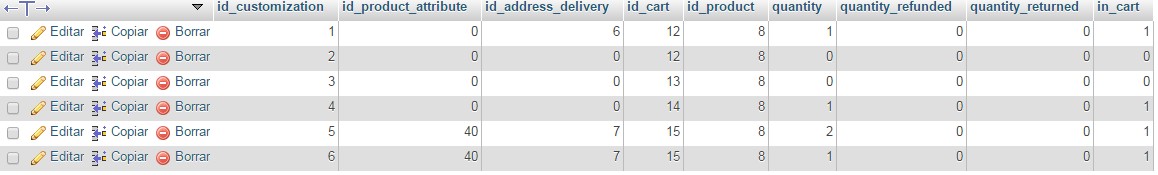 Dany developer Posted September 9, 2015 Author Share Posted September 9, 2015 He decidido agregar un campo directamente en el archivo de product.tpl y agregar los registros a la base de datos por medio de ajax y php. Lo logre hacer en una tabla pero me falta la tabla 'ps_customization' ya que no se como conseguir los datos de los campos por ejemplo: id_product_attribute, id_address_delivery, etc. casi todos los campo no tengo idea de como consegirlos para poder llenarlos con el php que prepare. Asi que si me pudieran ayudar para conseguir los campos se los agredeceria mucho, anexo imagen de los campso que vienen en la tabla. Saludos Link to comment Share on other sites More sharing options...