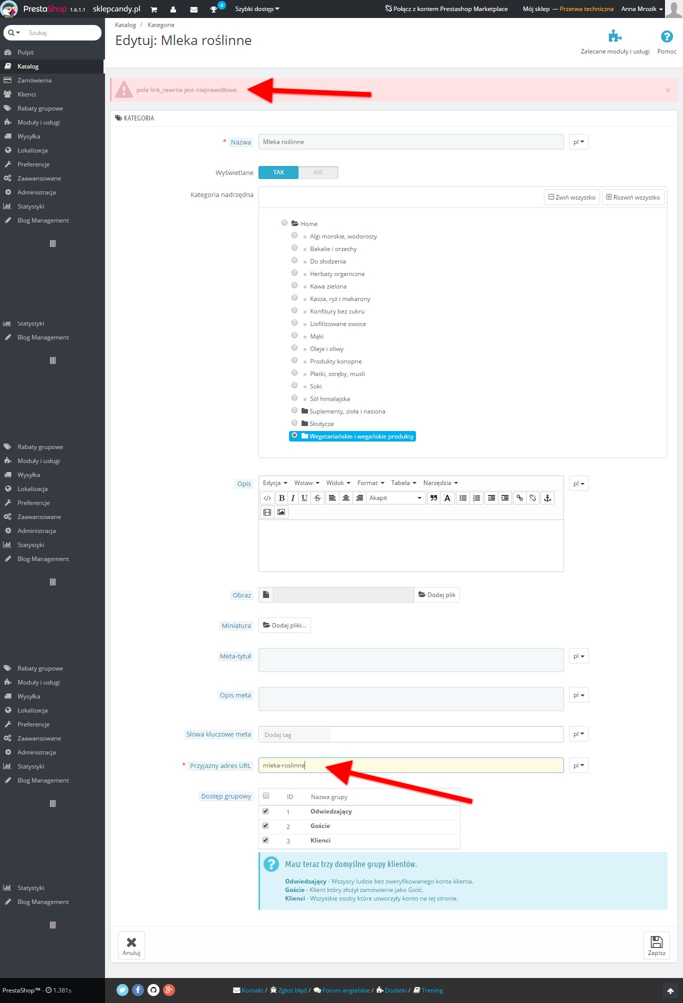 Dodaje zrzut ekranu (nie rozumiem co się dzieje) lecz nie chce się zapisać zmieniona kategoria w sklepie. Niektóre kategorie można zmienić a w niektórych wyskakuje błąd.