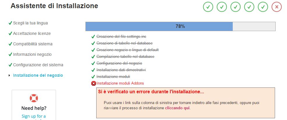 davzanar Posted September 3, 2015 Share Posted September 3, 2015 Dopo aver caricato via FTP i file della versione italiana (prestashop_1.6.1.1_it.zip) e avviato l'auto installer, mi si blocca durante l'installazione dei moduli Addons (78%). Se torno al passo precedente e rimuovo le tabelle, si blocca di nuovo nello stesso punto. Nella directory dei moduli, oltre alle directory dei moduli correttamente installati, mi ritrovo anche questi file .zip: blockwishlist.zip, cronjobs.zip, gamification.zip, onboarding.zip, productcomments.zip che non capisco da dove vengano, nello zip originale non li trovo. Eventualmente, esiste un log dettagliato prodotto durante l'installazione per capire dove si blocca esattamente? Link to comment Share on other sites More sharing options...