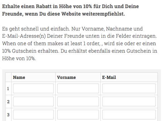Healthy Trade Posted September 4, 2015 Share Posted September 4, 2015 (edited) Hallo Zusammen, ich bin dabei das Kundenempfehlungsprogramm v1.7.1 von PrestaShop zu testen. Dabei habe ich mehrere Probleme bzw. Fragen die sich für mich auftun. Wie bzw. wo kann ich die AGB's bzw. Nutzungsbedingungen für das Empfehlungsprogramm einstellen? Übersetzung kann ich zwar ändern, aber es gibt einen Fehler welcher sich nicht beheben lässt - siehe Screenshot --> "Es geht schnell und einfach. Nur Vorname, Nachname und E-Mail-Adresse(n) Deiner Freunde unten in die Felder eintragen. When one of them makes at least 1 order, , wird sie oder er einen 10% Gutschein erhalten. Du erhältst ebenfalls einen Gutschein in Höhe von 10%." Bitte um eure Hilfe! DANKE! LG David Edited September 4, 2015 by Healthy Trade (see edit history) Link to comment Share on other sites More sharing options...