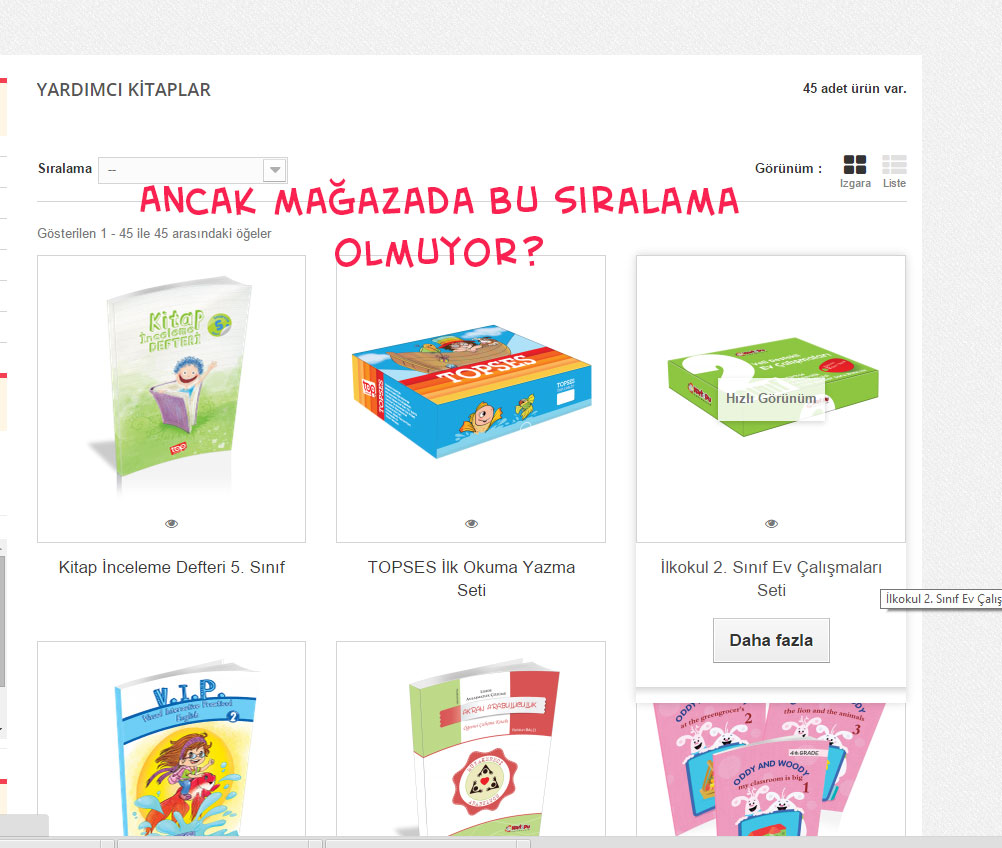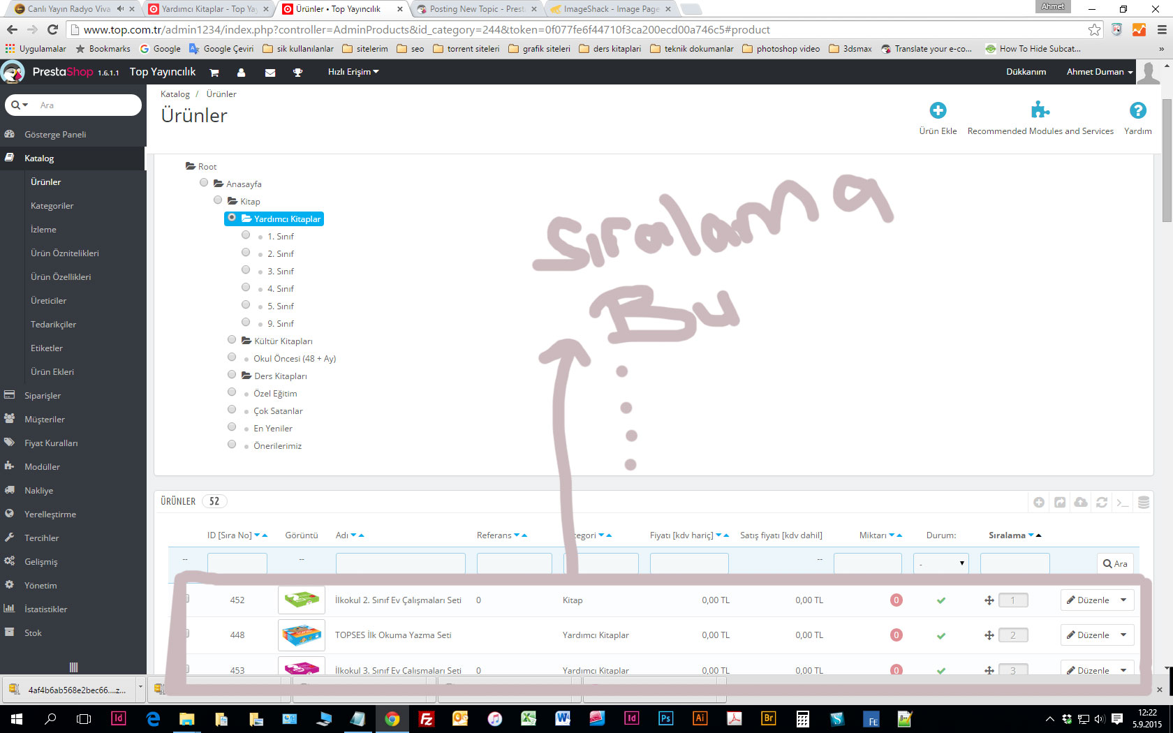 ahmetduman Posted September 5, 2015 Share Posted September 5, 2015 Arkadaşlar merhaba öncelikle yardımı geçen yada geçmeyen herkese teşekkür ederim. sorum şu olucak prestashop 1.6.1.1 son sürümü kullanıyorum. Site kitap sitesi olduğundan çok fazla kategori yapmak gerekiyor. Mesela Kitap -Yardımcı Kitaplar ---1. Sınıf ---2. Sınıf ---3. Sınıf -Ders Kitapları -Kültür Kitapları -Çok Satanlar -En Yeniler uzatmadan en kısa yoldan böyle bir menü sistemi var üst menü olarak. Sorun şu Alt kategorisi olmayan yada en alttaki kategoriyi Katalog->Ürünler->Kategoriye göre filtrele kısmından kategori ağacından açarak sonra da açılan taşıma ikonu ile istediğim sıraya sokabiliyorum. Ancak Alt kategorisi olan Kategoride ki mesela Yardımcı Kitaplar kategorisini admin panelindeki kategoriye göre filitrele menüsünden istediğim sıraya soktuğum halde Mağaza panelinde malesef yaptığım sıralamayla çıkmıyor. Bu sırada Tercihlerden-->Ürünler menüsünden Varsayılan sipariş bölümünü-->Kategori sıralaması içeriği olarakta yaptım. Analatabilmişimdir umarım. Siteye bakmak isteyenler: top.com.tr adresinden bakabilirler. Sadece en alt kategoriyi yada tek kategoriye sahip ürünleri değil bütün kategorileri ayrı ayrı sıralamak istiyorum. Nasıl yapabilirim. Aşağıda bir ek dosyası oluşturucam incelerseniz sevinirim. Link to comment Share on other sites More sharing options...