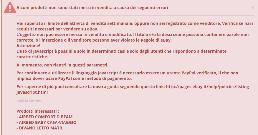 Prestalia Posted April 9, 2016 Share Posted April 9, 2016 ciao, il messaggio in rosso è la risposta che da eBay sul tuo account, da quanto si legge:- o hai delle limitazioni di vendita - o hai inserito del java nelle descrizioni e su ebay salvo sotterfugi non si può. per le tariffe, se non hai un account plus la pubblicazione è a pagamento i 90 gg gratis sono per il canone mensile del negozio. buona giornata Link to comment Share on other sites More sharing options...