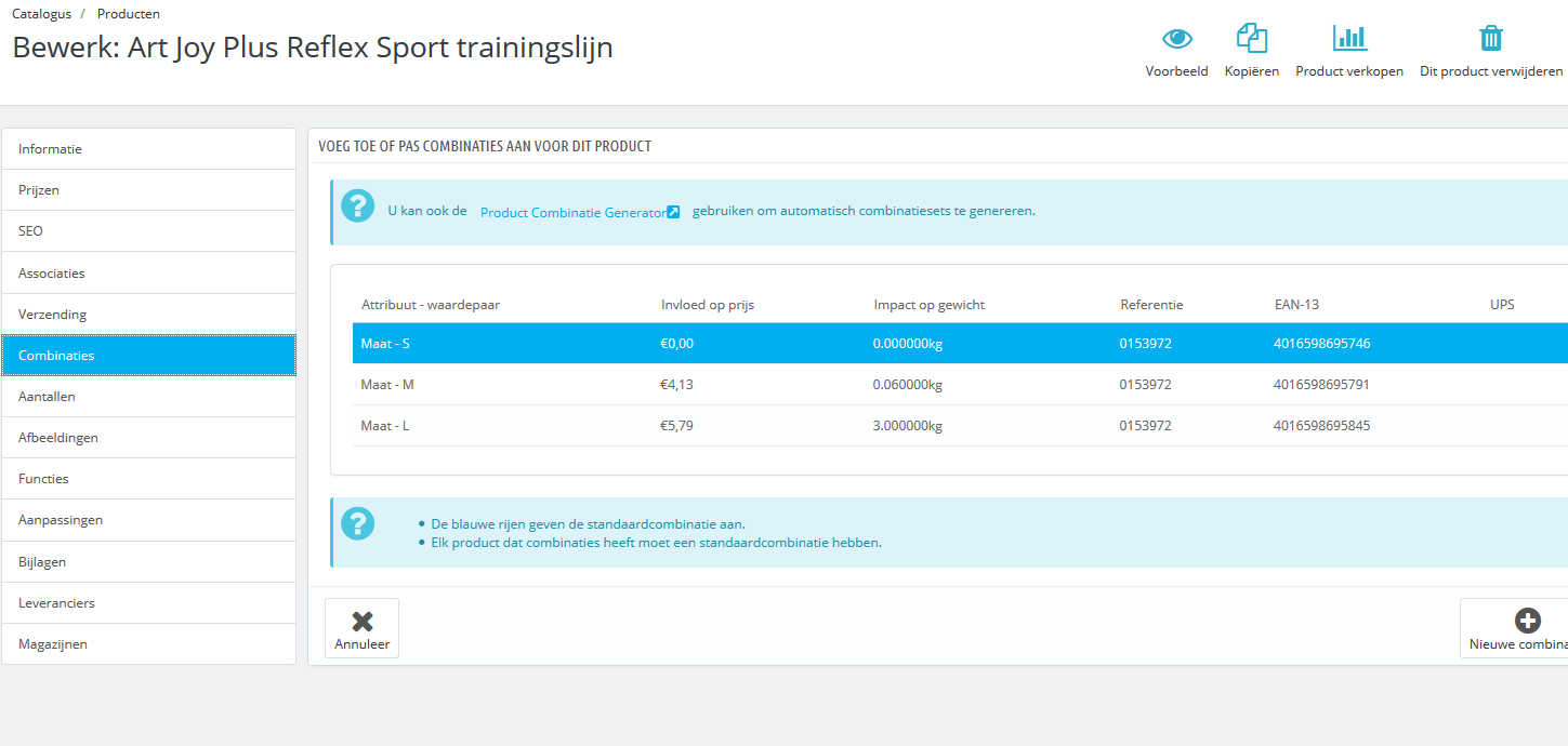 Binnen het tabblad combinaties van een product kan je aangeven dat een bepaalde maat duurder of goedkoper is dan de basisprijs en ook kan je daar aangeven of het gewicht hoger of lager moet worden aangepast.