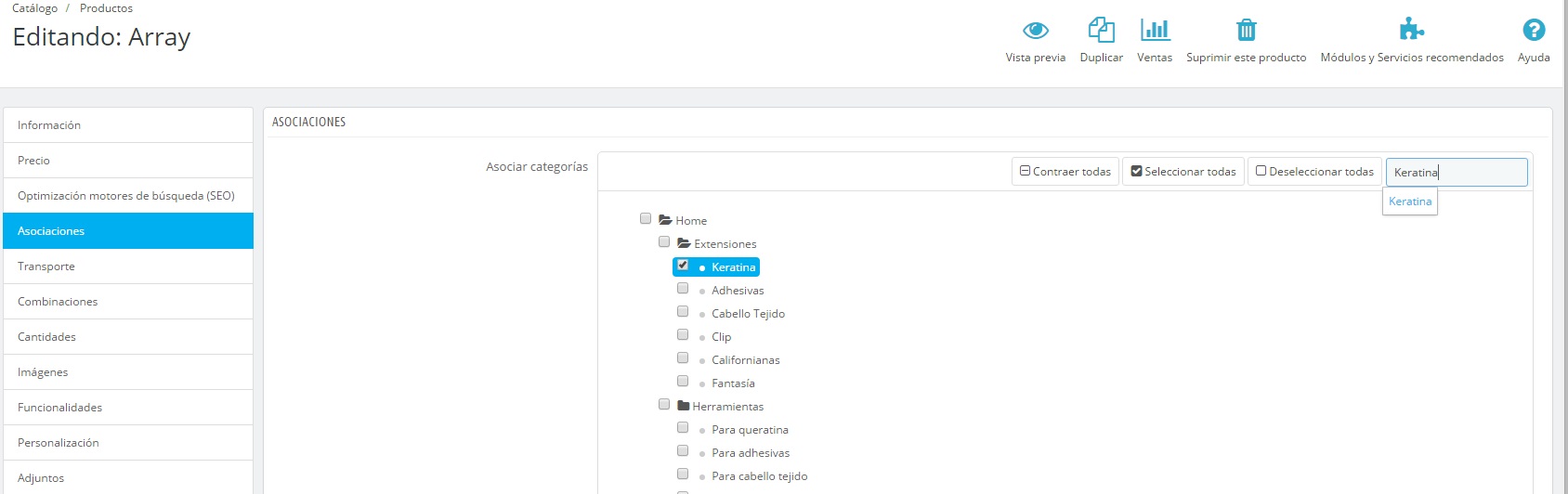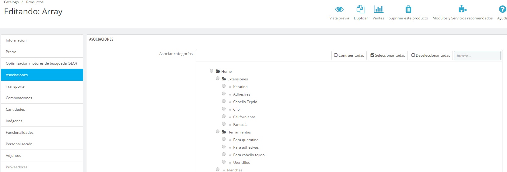 1. Si hago click en "Desplegar todas" aparece el árbol, pero en lugar de ser un 'checkbox' es una lista de opciones (sólo puedes elegir una) y cuando la eliges se redirige la página a la página principal del producto, es decir, no se asocia a la categoria, es un enlace.