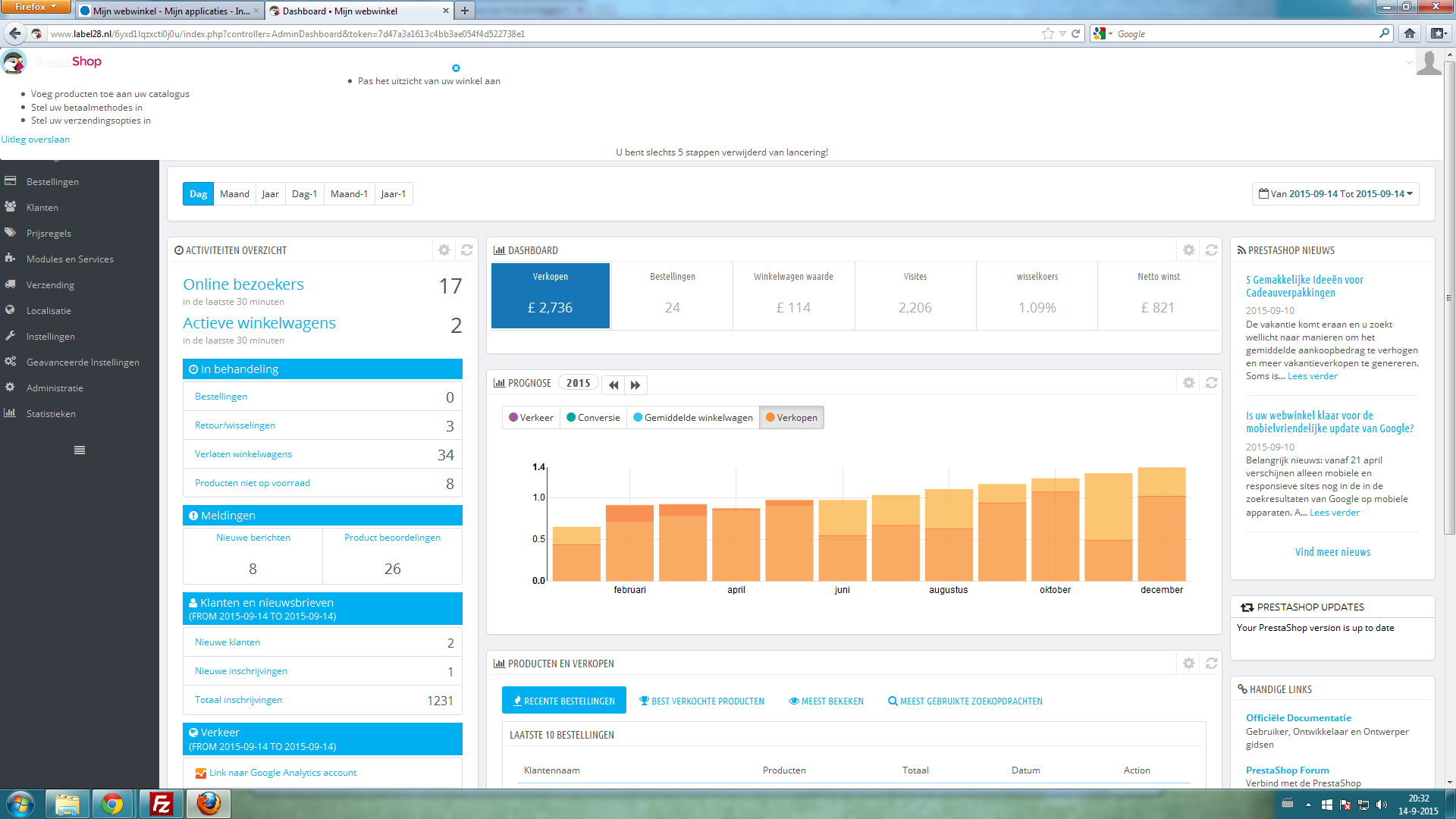 lisaakant Posted September 14, 2015 Share Posted September 14, 2015 (edited) I started today with prestashop and so in the top of my dashboard it says: only 5 steps to start. But i want this gone, because i cant use the categories on the side. But the little blue X or "overslaan (which means skip)" doesnt work. Also is there a lot of info in the dashboard which isnt mine! I just started, do not have any orders yet. Can someone please help me? oh yeah i tried a different browser, normaly i use Chrome, not firefox. Edited September 16, 2015 by lisaakant (see edit history) Link to comment Share on other sites More sharing options...
