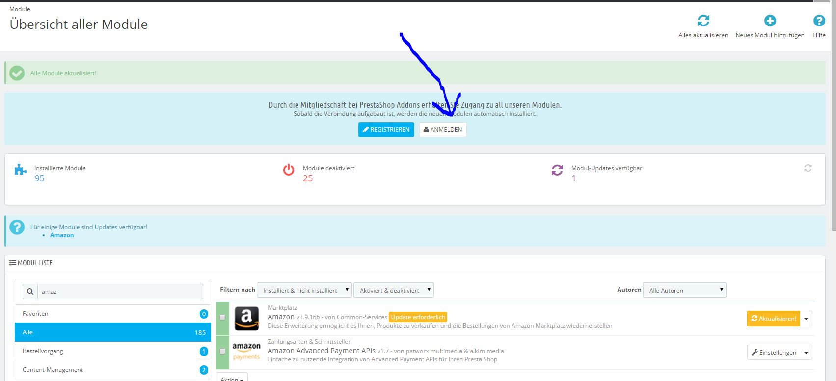Dr.Radon Posted September 19, 2015 Share Posted September 19, 2015 Hallo Prestafreunde, seit längerem schon können wir in unserem Backend nicht mehr mit dem Prestashop verbinden. Dadurch können wir keine Updates mehr von den gekauften Modulen durchführen. Wenn wir auf "Anmelden" klicken (siehe Bild), passiert einfach gar nichts. Wir haben verschiedene Browser und verschiedene Computer bereits versucht. Woran kann es liegen ? Grüße Martin Link to comment Share on other sites More sharing options...