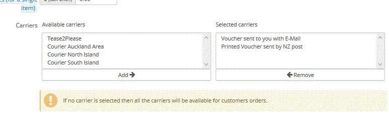 MarMis Posted September 22, 2015 Share Posted September 22, 2015 I have added a new shipping option to my carriers in prestashop. This shipping option is now added to all products, as by default all carriers are selected. But this shipping options was only intended for 2 of my products. How can I change the carriers on all my products? I know I can change this one by one in the 'shipping' field per product. As I have hundreds of products, that seems not a great option. Is there a possibility to change this maybe with a csv upload? Attached the one by one field option Link to comment Share on other sites More sharing options...