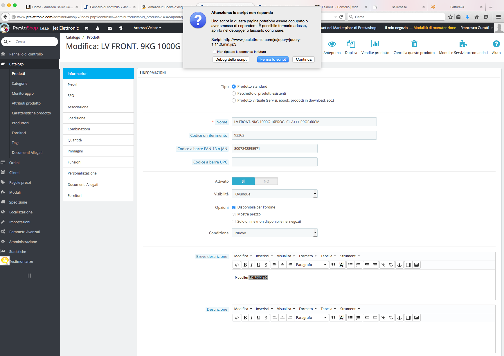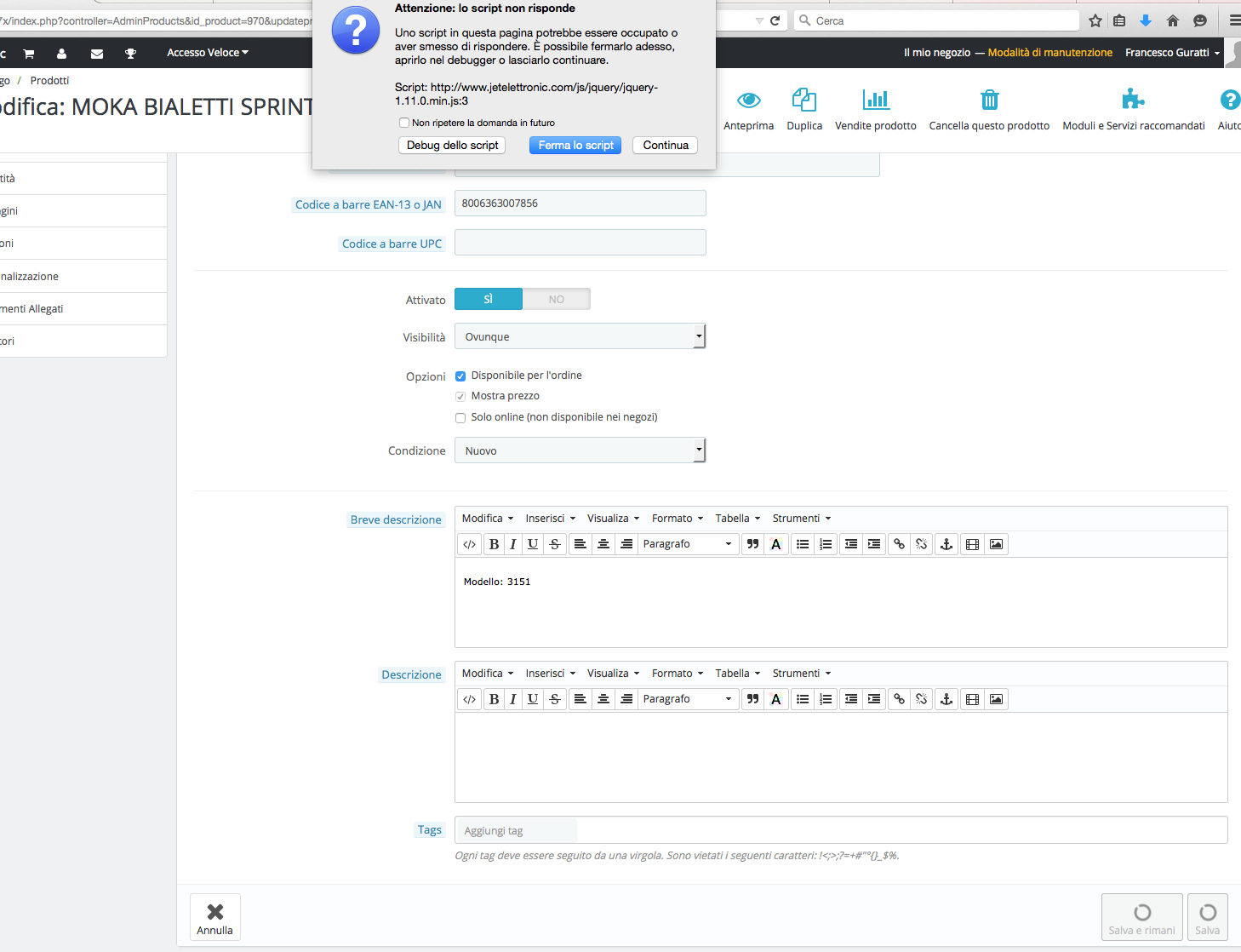 [email protected] Posted September 22, 2015 Share Posted September 22, 2015 Buonasera a tutti entrando nel dettaglio prodotto nel back-end la pagina mi va in debug con l'errore in allegato. Qualcuno puo aiutarmi a capire quale sia il problema e come risolvere? Ho provato anche con altri browser eliminando la cronologia e cache ma il risultato è lo stesso grazie Francesco Link to comment Share on other sites More sharing options...