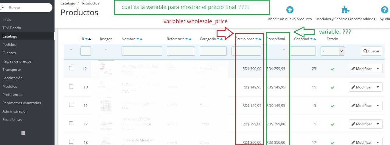 en la columna PRECIO esta refleja el precio de almacen (precio costo), lo que quiero es cambiarlo por el precio final del producto el que se muestra a lo clientes en la pagina.