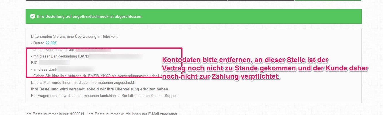 der.guen Posted September 25, 2015 Share Posted September 25, 2015 Moin... ich bin gerade dabei, für meinen Onkel einen Shop gem. den Vorgaben vom "Händlerbund" umzusetzen. Da stehe ich gerade beim letzten zu lösenden Punkt auf dem Schlauch, da ich die Stelle nicht finde, an der ich die Angabe der Bankdaten bei der Bestellstätigung detailliert entfernen kann. Denn lt. Aussage der Juristin beim Händlerbund sollten diese Angaben noch nicht da stehen, sonder erst in der E-Mail... Wenn ich die Zeile "{$HOOK_PAYMENT_RETURN}" in der "order-conforamtion.tpl" im entsprechenden Theme löschen ist alles weg? Ich will aber lediglich die Bankdaten nicht angezeigt bekommen, die sonstige Info schon!Jemand einen Tipp für mich?? mit einem "Danke" im Voraus! Link to comment Share on other sites More sharing options...