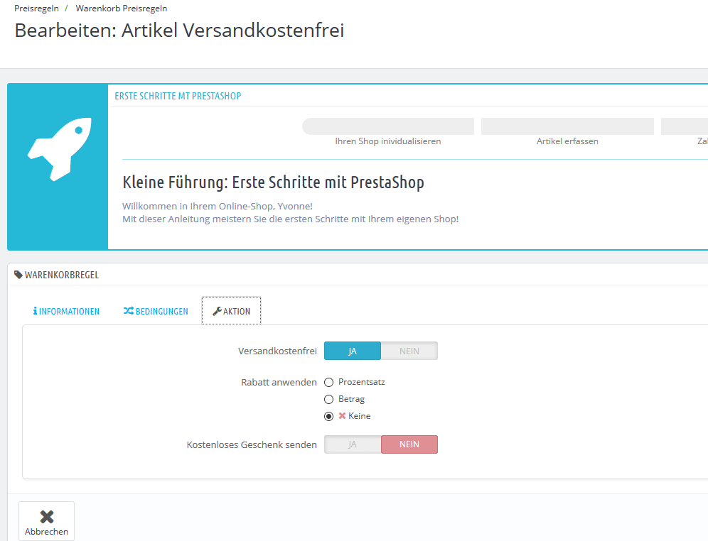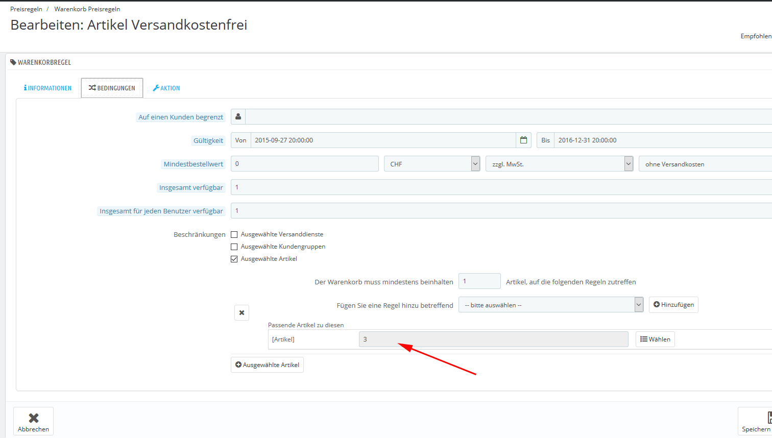Birel34 Posted September 27, 2015 Author Share Posted September 27, 2015 Hallo Kulli Besten Dank... einen Schritt weiter bin ich... aber noch nicht ganz am Ziel. Zuerst will ich noch ergänzen, dass im Versnad allgemein eingestellt ist, dass ab einem Bestellwert von CHF 200.- Versandkostenfrei ist. Nun habe ich folgende Einstellunge in "Warenkorb Preisregeln" folgende Einstellunge gemacht, siehe Bilder: Nun passiert folgendes: Wenn ich nur einen Geschenkgutschein bestelle, ist er Versandkostenfrei und das ist richtig. Wenn ich nun einen Geschengutschein und ein Produkt im Wert von CHF 45.- bestelle, kommt für alles Versandkostenfrei.In diesem Fall sollten die Versankosten erhoben werden, weil alle Artikel nur als Paket versendet werden können. Wie kann man noch einstellen, dass es in diesem Fall mit Versnakosten berechnet wird? Besten Dank für Deine Hilfe. Herzliche Grüsse Rolando Link to comment Share on other sites More sharing options...