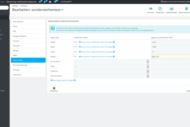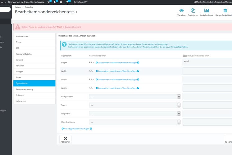 zbernhard Posted September 28, 2015 Share Posted September 28, 2015 Hallo habe folgendes Problem: wenn ich via Backend bei den Artikeleigenschaften Sonderzeichen eingebe, bekomme ich beim Abspeichern eine Fehlermeldung (gültiger Name für Merkmal .... erforderlich ) und die Eigenschaften werden nur bis zum "ungültigen" Wert gespeichert. Artikelnamen dürfen Sonderzeichen enthalten also wieso nicht auch Artikelmerkmale ? .. Es scheint mir, dass es sich dabei um ein Felddefinationssproblem im Prestashop direkt zu handeln, denn wenn ich den StoreManager (von eMagic One) verwende, kann ich problemlos Sonderzeichen bei den Merkmalen eingeben und diese werden auch abspeichern. Link to comment Share on other sites More sharing options...