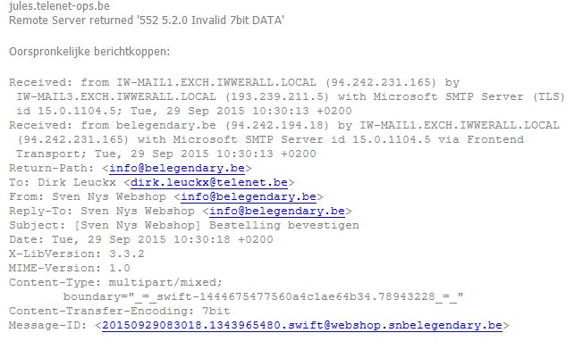 WBXIV Posted September 29, 2015 Share Posted September 29, 2015 Prestashop 1.6.0.9 default bootstrap Hallo, Krijg telkens bijgevoegde error naar @telenet.be adressen. Uitleg van telenet is de volgende: Vermoedelijk worden de mails verstuurd met een 8bit mail body (dus ISO-8859-* of UTF-8) zonder dit aan te kondigen. Dit is niet SMTP compliant, we wpreken hier van broken mailer software. Waarschijnlijk gaat dit plrobleem ook bij andere geadresseerden voorkomen, afhankelijk van de implementatie. In principe moeten de host ofwel de content in de traditionele 7bit encoding steken (dmv. base64 of quoted-printable), ofwel moeten ze de smtp extensie 8BITMIME (rfc 6152) gebruiken. Hostingprovider zoekt in prestashop naar een mogelijke oplossing, maar nog niets gevonden ... Het rare is nadat de shop gemigreerd is naar een ander domein (zelfde provider) dat het probleem ontstaan is. Probleem is dat ik eerlijk gezegd van het bovenstaande niet veel begrijp. Zou in de eerste plaats willen weten of dit iets is dat aan te passen is in PS of dat het aan de instellingen van de mailserver ligt van de provider. thx Link to comment Share on other sites More sharing options...