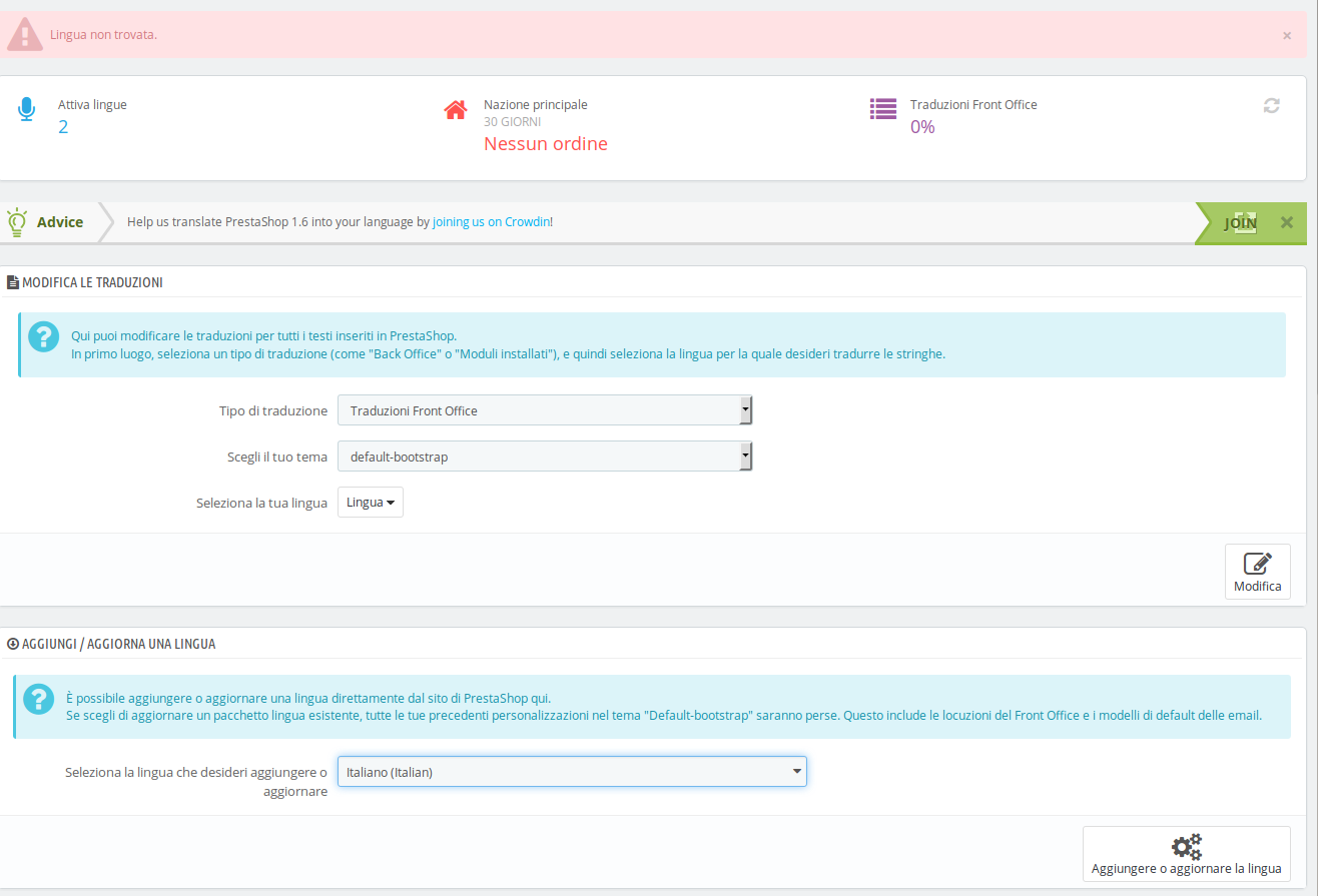 BBService Posted September 29, 2015 Share Posted September 29, 2015 Ragazzi riscontro problemi ad aggiornare la lingua di questi 2 pacchetti su diversi ecommerce con prestashop 1.6.1. Localizzazione > Traduzioni > Aggiungere o aggiornare la linguaIl risultato è : Lingua non trovata. Ovviamente provo sia Italiano che Inglese USA e non funziona. A voi risulta che funzioni? PS. Tutte le altre lingue funzionano. Link to comment Share on other sites More sharing options...