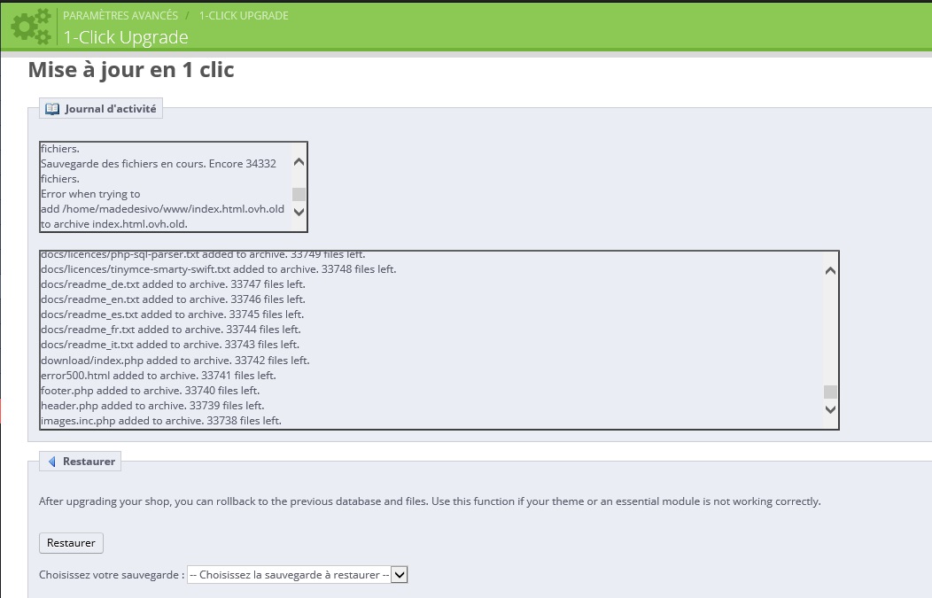 Eolia Posted September 30, 2015 Share Posted September 30, 2015 supprimez ce fichier index.html.ovh.old qui ne sert à rien et bloque votre sauvegarde préalable^^ Link to comment Share on other sites More sharing options...