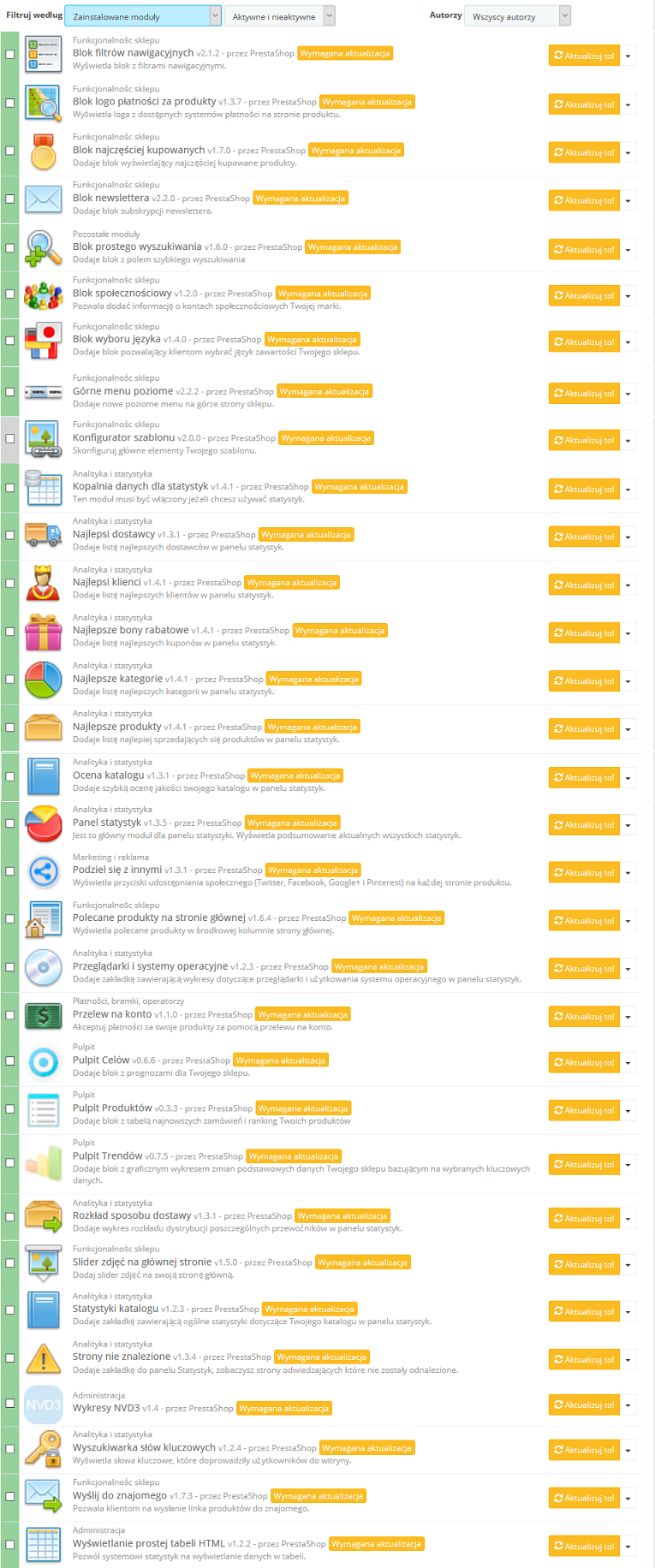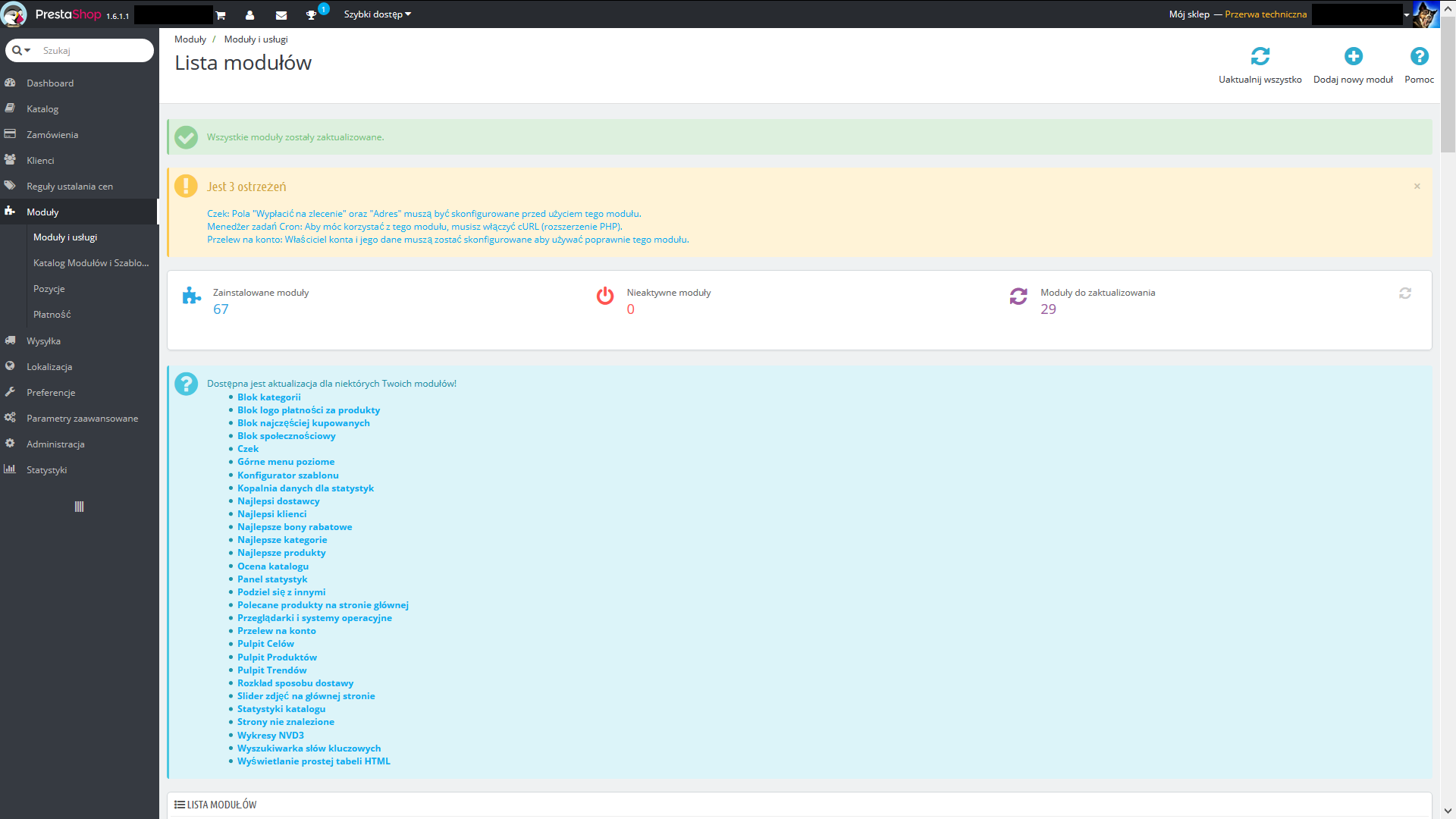 Postanowiłem zmienić hosting z cloud na klasyczny. Zainstalowałem więc najnowszą wersję presty 1.6.1.1. Wszystko ładnie pięknie, tylko na czystej konfiguracji nie mogę w żaden sposób aktualizować modułów. Dostaję komunikat, że wszystkie moduły zostały zaktualizowane, ale poniżej listuje mi te same moduły do aktualizacji. Proszę o pomoc.