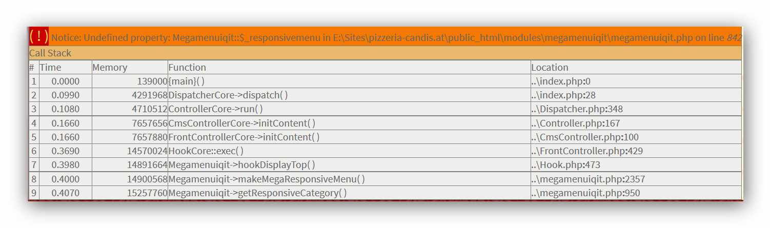 PCAAdmin Posted October 3, 2015 Share Posted October 3, 2015 Hello, I am in the process of updating v1.5.6.1 to 1.5.6.3 in order to fix the recently announced security issue, as v1.6 causes to many fixing-requirements.For that purpose I copied the whole current software to my local server (localhost), where it seems to run quite fine with one exception: Every page of the home-section creates an error message ... "Notice: Undefined property: Megamenuiqit::$_responsivemenu in E:\Sites\pizzeria-candis.at\public_html\modules\megamenuiqit\megamenuiqit.php on line 842" ... with some additoinal debug-data as shown in attached screenshot. The page following that error message seems to display perfectly fine, but still I want to correct this error before upgrading to the newer version. I do dearly hope someone can help me to fix this issue! Sincere thanks in advance! Link to comment Share on other sites More sharing options...