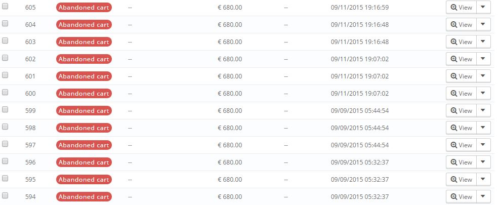 ArtistToonz Posted October 3, 2015 Share Posted October 3, 2015 Help! Can't figure this one out. In advance, thanks for your help. (Prestashop 1.6.0.9) See the attached file. In the Customer Shopping Cart section there are 12 Abandoned cart listings with the exact same two items in it. Check the date and times. Some are exactly at the same time, same day or different days. Why is this happening? How could one order & abandon the same thing at the same time? Anyone else have this situation? How does this problem get solved? Link to comment Share on other sites More sharing options...