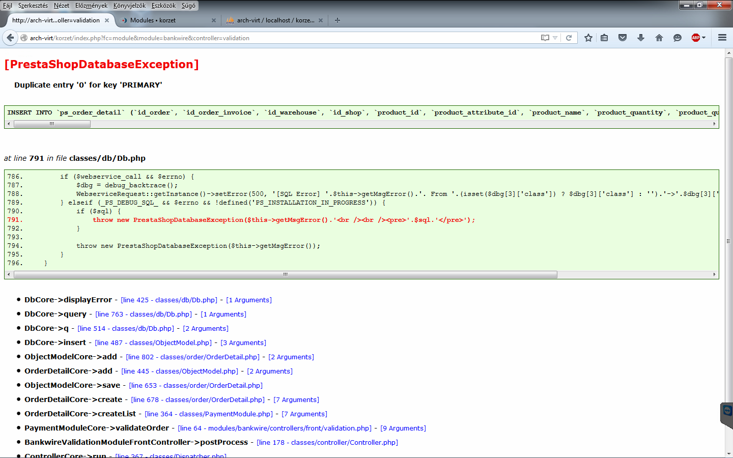 djozsi Posted October 6, 2015 Share Posted October 6, 2015 Sziasztok. ver: 1.6.1.1 Két plusz modul van telepítve a universalpay és a cod+, mindkettő a legfrissebb. A két modul azért kellett, mert nem lehet másképp összerendelni a szállítást a fizetéssel meg az utánvét összegével, ami egy vicc, de ez van. Minden feltöltve, beállítva, jött a próbarendelés és a megrendelés véglegesítésénél a hibaüzenet, hogy a rendelési állapot érvénytelen. Újabb próba ekkor már 500 server error hibaüzi. Adminban ott a megrendelés, de 0-ás id-vel 0 Ft-al és a rendelési állapot --. Megnézni nem lehet. Átírtam az adatbázisban az order-id-t 1-re és ekkor már meglehetett nézni a rendelést. Ekkor debug mód és egy új rendelés végén a hibaüzenet. (direkt beépített modulokat használtam, tehát futár és banki előreutalás), hogy kizárjam az idegen modulokat. Csatolom a hibaüzit. Szívesen venném az ötleteket. Köszi. Az insert into bekopizom, mert hosszú, és szintén bekopizom a forráskódot, mert kilóg az ablakból. INSERT INTO `ps_order_detail` (`id_order`, `id_order_invoice`, `id_warehouse`, `id_shop`, `product_id`, `product_attribute_id`, `product_name`, `product_quantity`, `product_quantity_in_stock`, `product_quantity_return`, `product_quantity_refunded`, `product_quantity_reinjected`, `product_price`, `reduction_percent`, `reduction_amount`, `reduction_amount_tax_incl`, `reduction_amount_tax_excl`, `group_reduction`, `product_quantity_discount`, `product_ean13`, `product_upc`, `product_reference`, `product_supplier_reference`, `product_weight`, `tax_name`, `tax_rate`, `tax_computation_method`, `id_tax_rules_group`, `ecotax`, `ecotax_tax_rate`, `discount_quantity_applied`, `download_hash`, `download_nb`, `download_deadline`, `unit_price_tax_incl`, `unit_price_tax_excl`, `total_price_tax_incl`, `total_price_tax_excl`, `total_shipping_price_tax_excl`, `total_shipping_price_tax_incl`, `purchase_supplier_price`, `original_product_price`, `original_wholesale_price`) VALUES ('0', '0', '0', '1', '312', '988', 'NO4 Talpbetét NOENE - Méret : 39', '1', '0', '0', '0', '0', '9448.818898', '0', '0', '0', '0', '0', '0', '', '', 'EG211', '', '0', '', '0', '0', '1', '0', '0', '0', '', '0', '0000-00-00 00:00:00', '12000', '9448.818898', '12000', '9448.82', '0', '0', '0', '9448.818898', '0') 786. if ($webservice_call && $errno) {787. $dbg = debug_backtrace();788. WebserviceRequest::getInstance()->setError(500, '[SQL Error] '.$this->getMsgError().'. From '.(isset($dbg[3]['class']) ? $dbg[3]['class'] : '').'->'.$dbg[3]['function'].'() Query was : '.$sql, 97);789. } elseif (_PS_DEBUG_SQL_ && $errno && !defined('PS_INSTALLATION_IN_PROGRESS')) {790. if ($sql) {791. throw new PrestaShopDatabaseException($this->getMsgError().'<br /><br /><pre>'.$sql.'</pre>');792. }793. 794. throw new PrestaShopDatabaseException($this->getMsgError());795. }796. } Link to comment Share on other sites More sharing options...