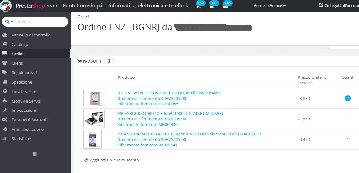 seto_ichi Posted October 8, 2015 Share Posted October 8, 2015 (edited) Buongiorno a tutti, sono circa 1 anno che utlizzo Prestashop , ora ho installato al versione 1.6.1.1,da circa un paio di mesi, sia nella versione precedente che in quella odierna ho sempre notato che il "Numero di Riferimento" all'interno dell'ordine per ogni singolo articolo rimane sempre uguale , ho allegato un Screen di un ordine. Il numero di riferimento che compare " 99HZS005-00 " ,e' di un prodotto che e' stato eliminato perchè non più a listino. ho notato inoltre che anche nella fattura,che al momento non utilizzo ma che intendo utilizzare a breve, per ogni riga articolo esce sempre lo stesso " Riferimento" 99HZS005-00Spero possiate aiutarmi , grazie MauroNon so se posso indicare il sito.... se voleste fare delle prove lo indicherò privatamente Edited October 9, 2015 by seto_ichi (see edit history) Link to comment Share on other sites More sharing options...