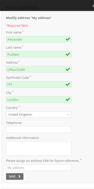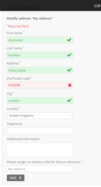 serdib Posted October 13, 2015 Share Posted October 13, 2015 Добрый день! Не могу победить проблему. В бэкофисе (Localization-Countries) поле индекса оставляю пустым, чтобы он не проверялся. Однако при вводе индекса покупателем поле подсвечивается красным, если в нем присутствуют буквы. При этом сохранить такой адрес позволяет. Пробовал применить решение из этой темы — https://www.prestashop.com/forums/topic/465238-prestashop-16-zippostal-code-error/ — результата нет. Отключить поле индекса совсем не могу, т.к. оплата принимается через PayPal, и без него оплата не проходит. Prestashop 1.6.1.1 Шаблон Warehouse 3.6.2 (лицензионный) Страна — UK (индекс может содержать буквы и цифры, но единого шаблона для всей Великобритании нет) Опробовано в Chrome, Internet Explorer, Opera. Буду рад любой помощи. Спасибо. Link to comment Share on other sites More sharing options...
