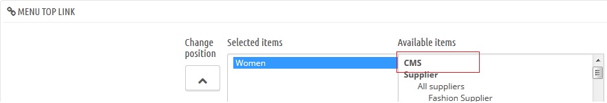 minion_bob Posted October 13, 2015 Share Posted October 13, 2015 Hi! Fairly new to prestashop, but getting the hang of it. I have messed around with my layout, and i am pretty happy with it, and today i wanted to add links to my CMS pages. When i tried adding them to my menu, i found that it was not possible to select any of them (see attachment). The 'CMS' root is there, but no pages. I have tried adding new pages under pref->CMS, but none of them will show up in the menu. I am quite sure i caused this issue myself, but does anyone have any hints as to how i can get the CMS pages to show up and be selectable again? Cheers! Link to comment Share on other sites More sharing options...