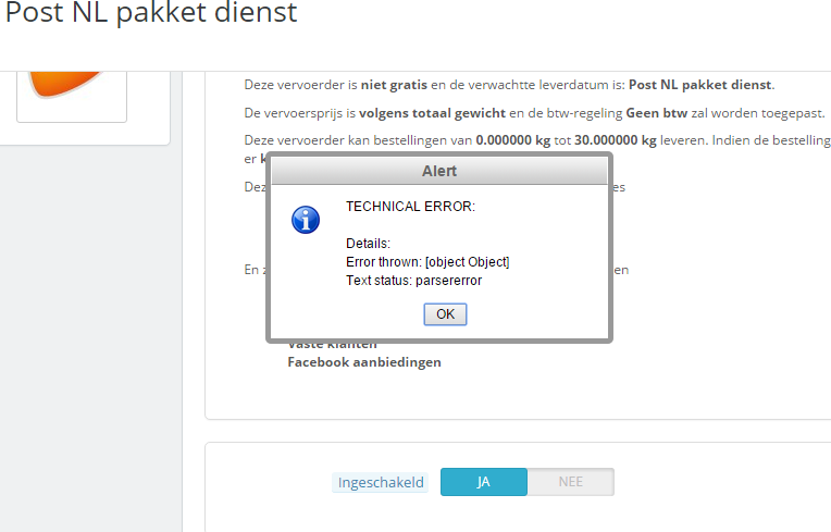 renezo Posted October 21, 2015 Author Share Posted October 21, 2015 postnl fout.PNG Deze optie lijkt te werken echter bij het voltooien krijg ik een parse error. Er wordt een nieuwe vervoerder (met nieuw ID) aangemaakt (kopie) in plaats van dat de vervoerder aangepast wordt Iemand enig idee wat de foutmelding inhoud ?? postnl fout.PNG Beste Racemaniac, In mijn database kan ik zien dat bij iedere wijziging weer een nieuwe vervoerder wordt aangemaakt waarbij de oude wordt uitgeschakeld. Voor de goede orde mijn oplossing werkt in versie 1.5.3.1. Succes. Link to comment Share on other sites More sharing options...