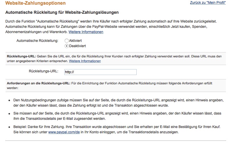 schibulski Posted October 19, 2015 Share Posted October 19, 2015 Hast du eventuell in deinen Einstellungen bei PayPal (Auf der Website, nicht in den Moduleinstellungen) an dieser Stelle etwas eingetragen? Die Felder sollten leer sein wenn du das Paypal Modul nutzt. Die Rückleitung erfolgt durch die API selbst. Link to comment Share on other sites More sharing options...