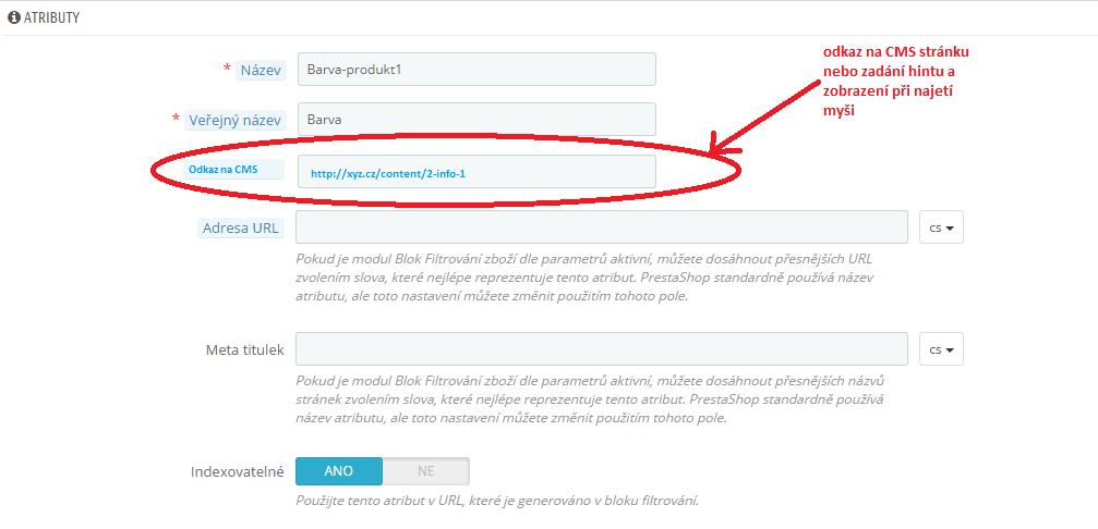 sw4all Posted October 22, 2015 Share Posted October 22, 2015 Prestashop 1.6.1 Ahoj všem, rád bych přidal pole do administrace při vytváření atributu a jeho názvu obrázek s odkazem na CMS stránku. V administraci se do pole Veřejný název zapíše "Barva" a zde bych chtěl přidat odkaz na CMS stránku. Bohužel nepodporuje speciální znaky. Tak bych rád pod toto pole přidal další pole s vložením odkazu na CMS stránku nebo hint. V šabloně tpl doplnit odkaz na CMS stránku nebo zobrazení hintu. Do databáze přidat pole cms nebo hint. Moje představa v obrázku. Když mi poradíte, kde hledat dosavadní modul a kde doplnit pole v administraci, možná bych se tím i propracoval. Díky Myslím, že taková úprava pomůže mnohým a rád bych aby byla zdarma. Link to comment Share on other sites More sharing options...