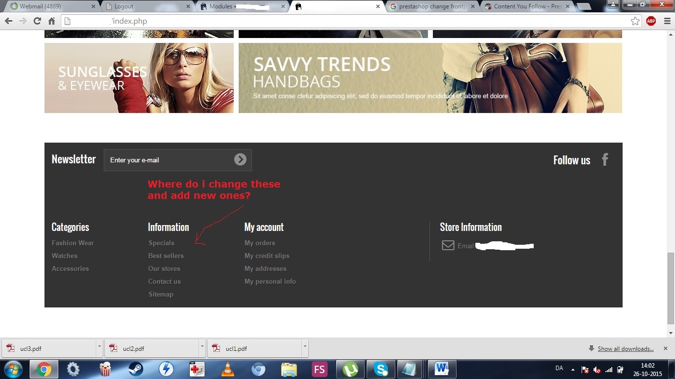 niddo Posted October 26, 2015 Share Posted October 26, 2015 (edited) Hey Presta where do i change these information categories and add new ones? screenshot: thanks Edited October 26, 2015 by niddo (see edit history) Link to comment Share on other sites More sharing options...
